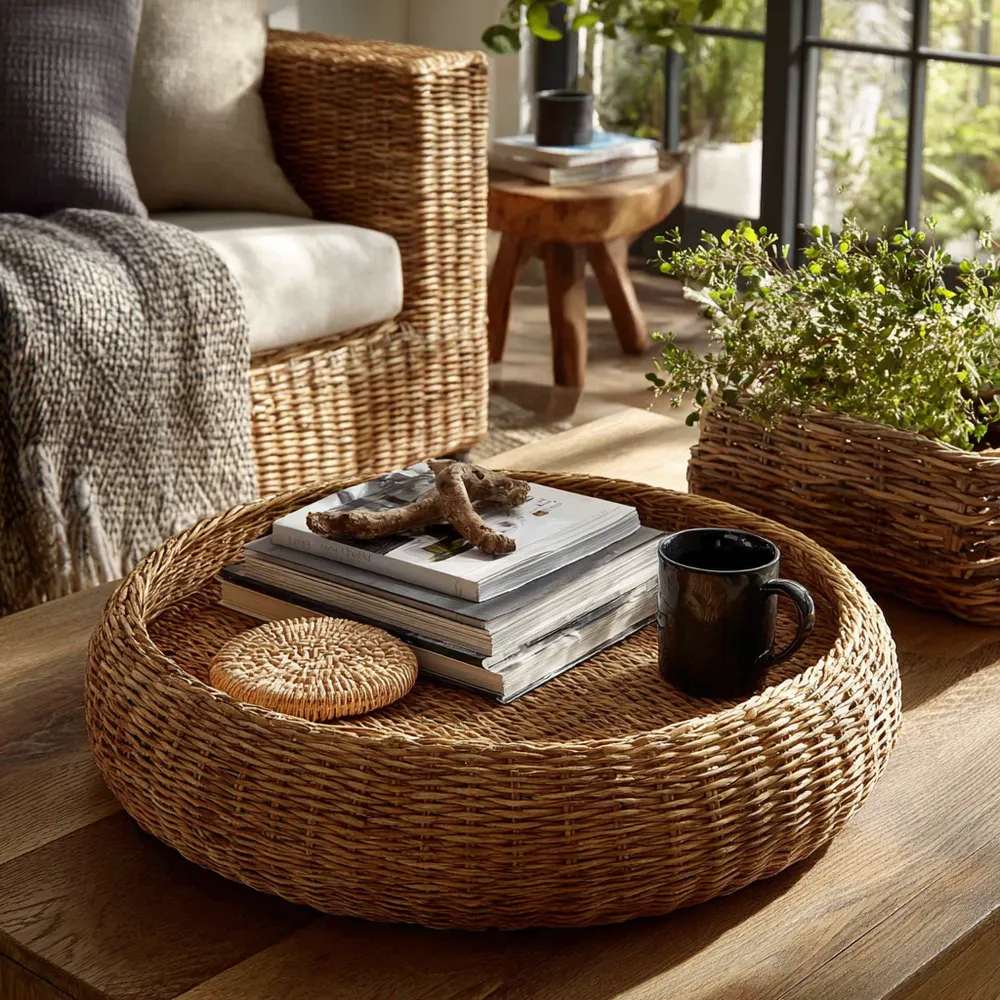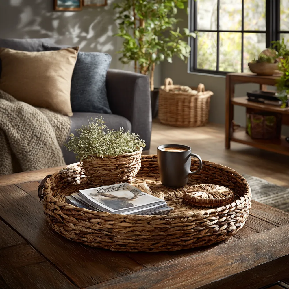 Start with a natural material tray – rattan, wood, or even woven seagrass. Layer within the tray: stack of interesting books, a small potted plant, and a decorative candle or diffuser.