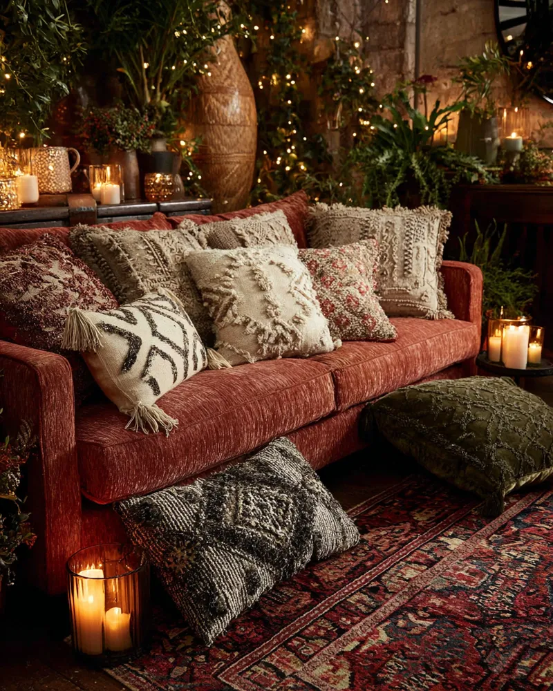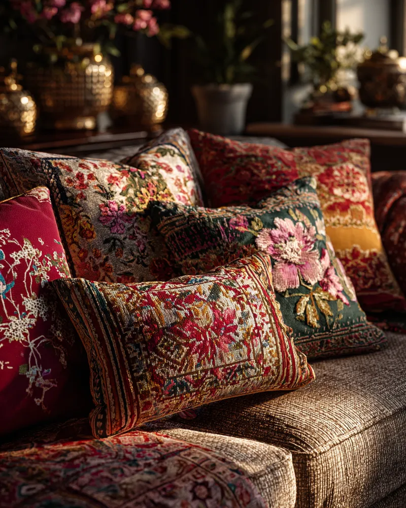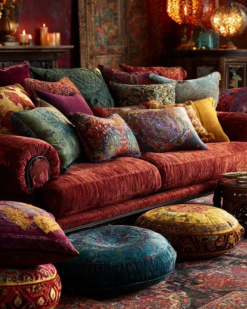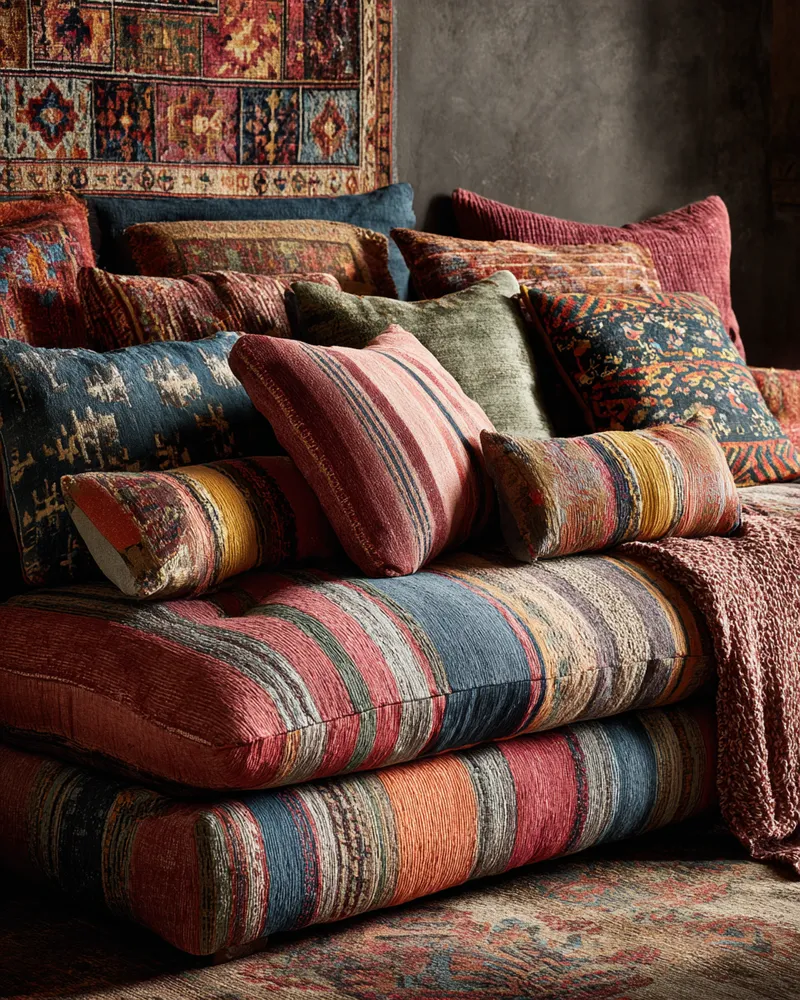 Embrace a variety of patterns: geometric prints, global motifs, floral designs, and abstract art. Combine sizes and shapes for dynamic appeal. Layer them generously on sofas, chairs, and floors.