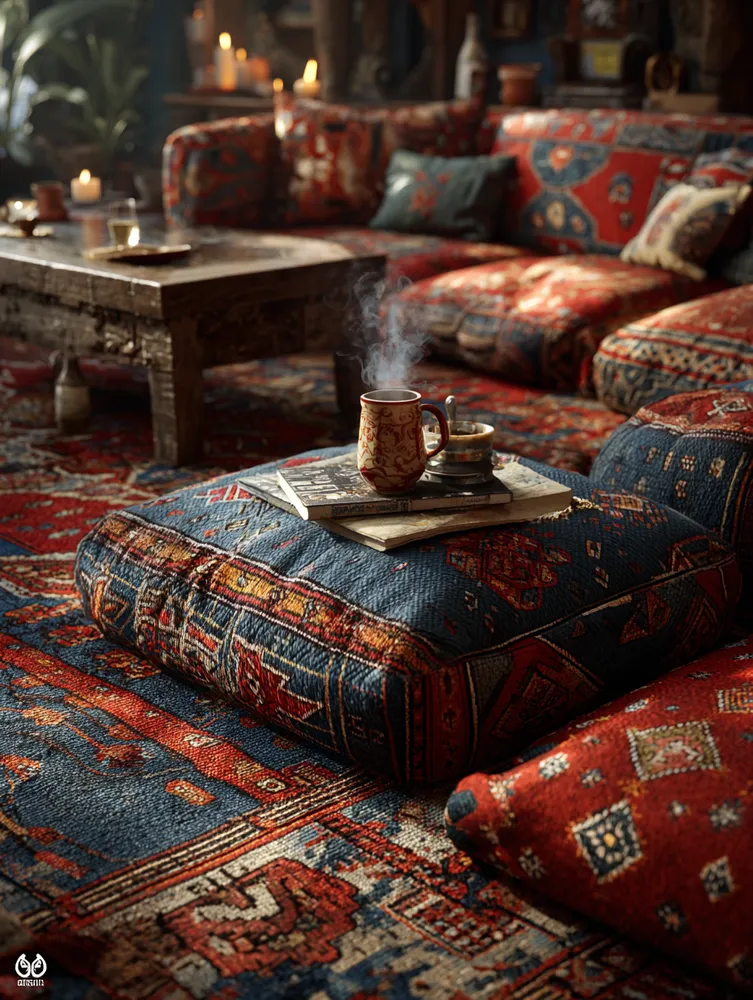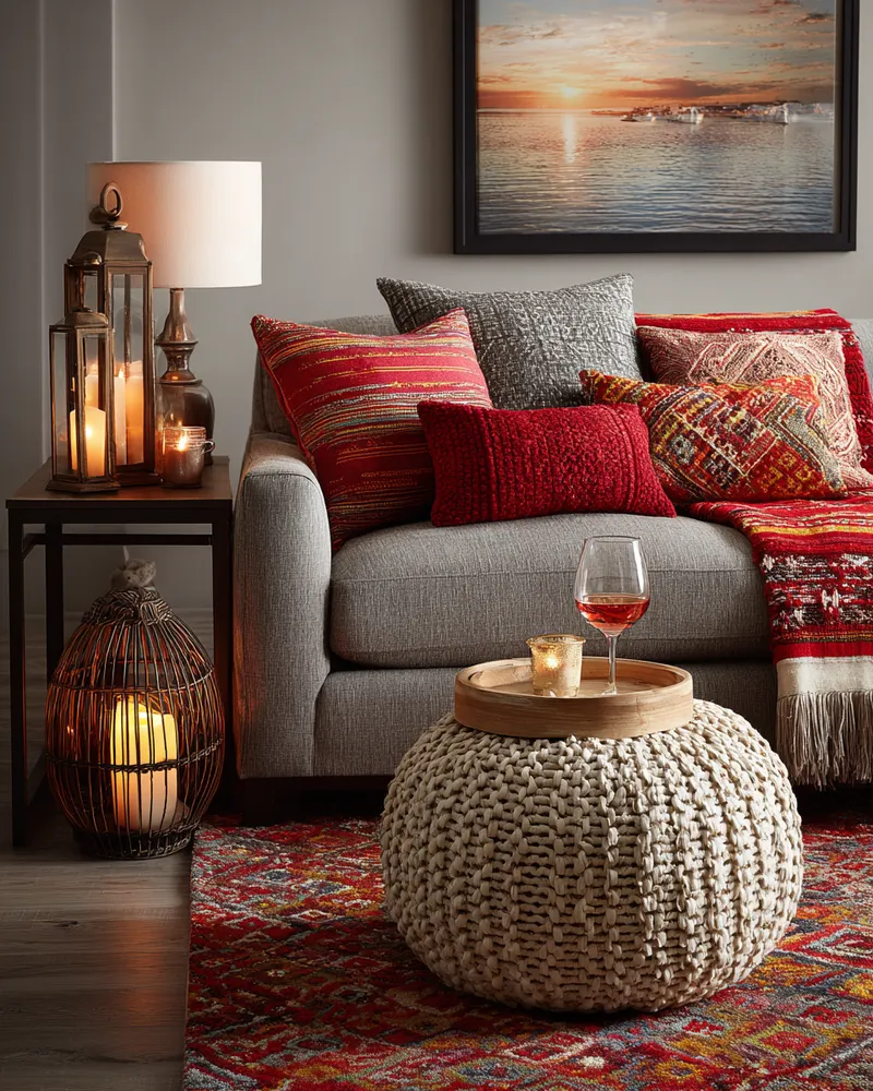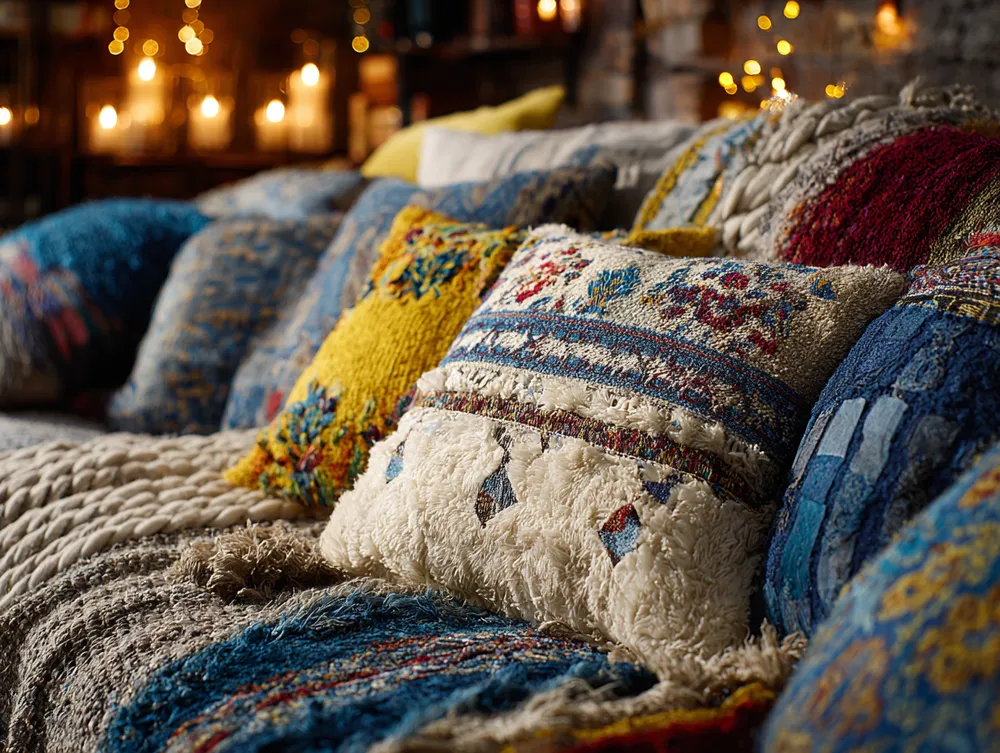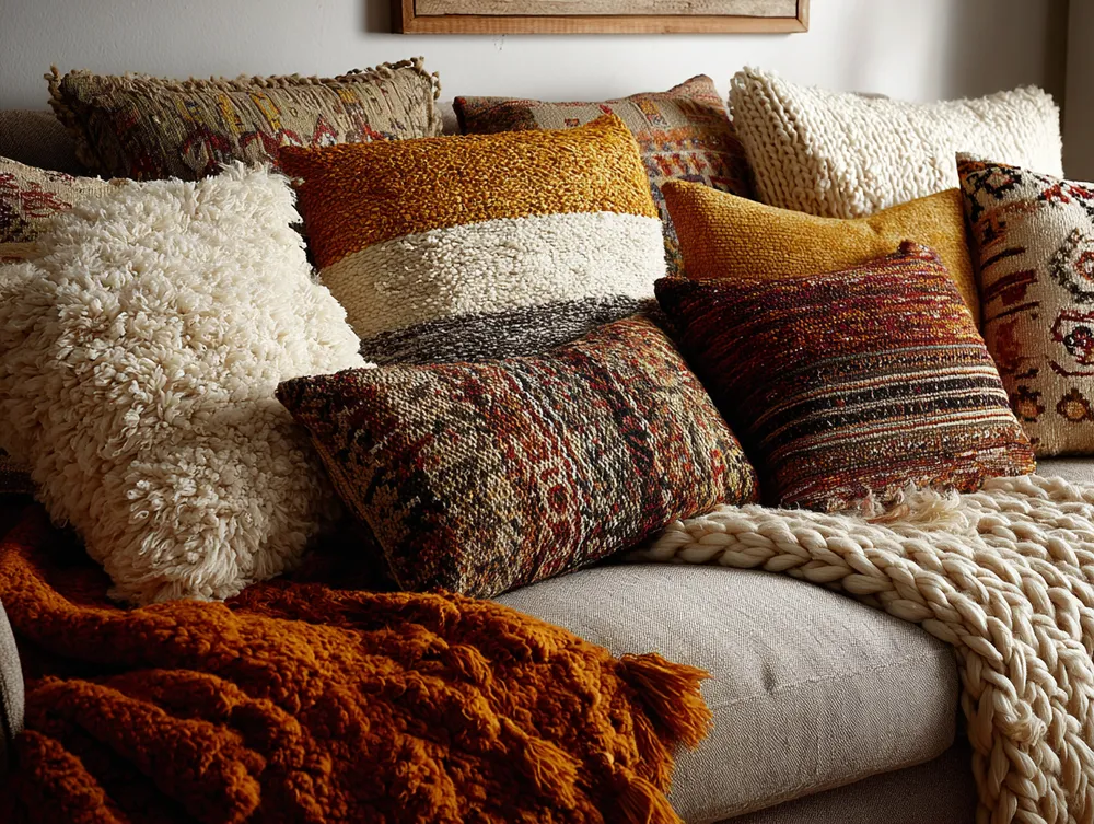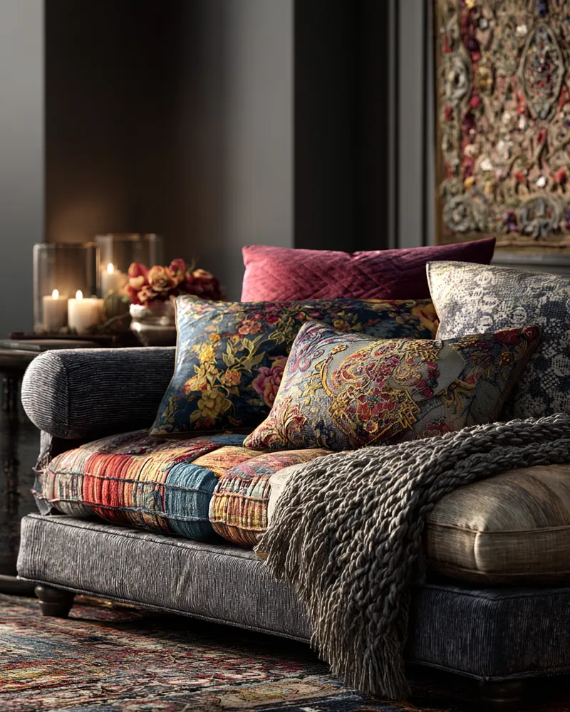 Embrace a variety of patterns: geometric prints, global motifs, floral designs, and abstract art. Combine sizes and shapes for dynamic appeal. Layer them generously on sofas, chairs, and floors.