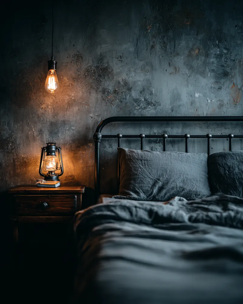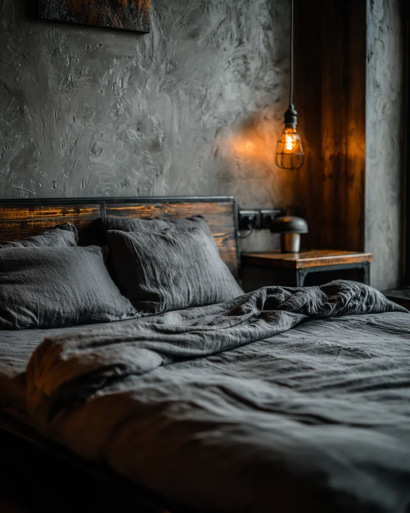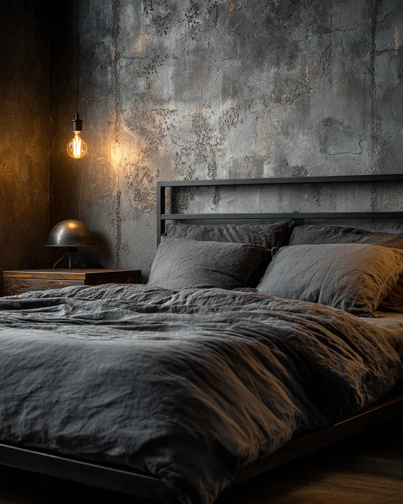 Who says industrial can't be cozy? Create a sanctuary with a blend of tough textures and warm comfort. Think a bed frame made of dark metal or reclaimed wood. Accent walls can feature a painted concrete finish or a subtle dark plaster. Layer in soft, neutral bedding – think charcoal grey, deep navy, or muted olive. Industrial-chic lighting, like a single overhead exposed bulb or wall-mounted sconces with metal detailing, adds the perfect moody ambiance. 🌙