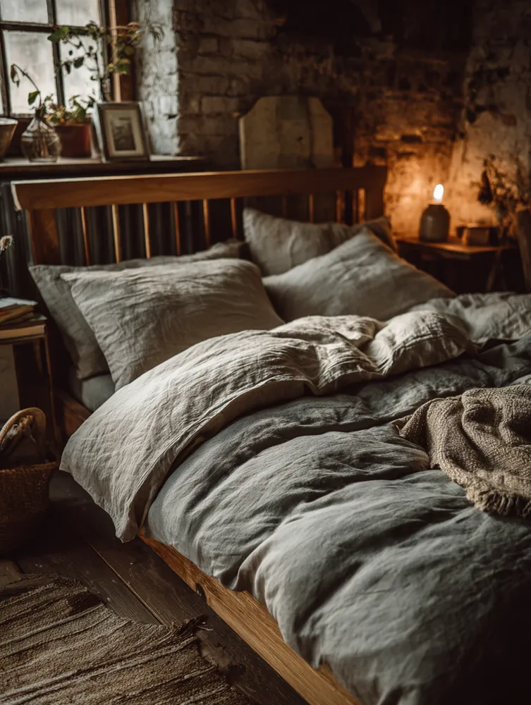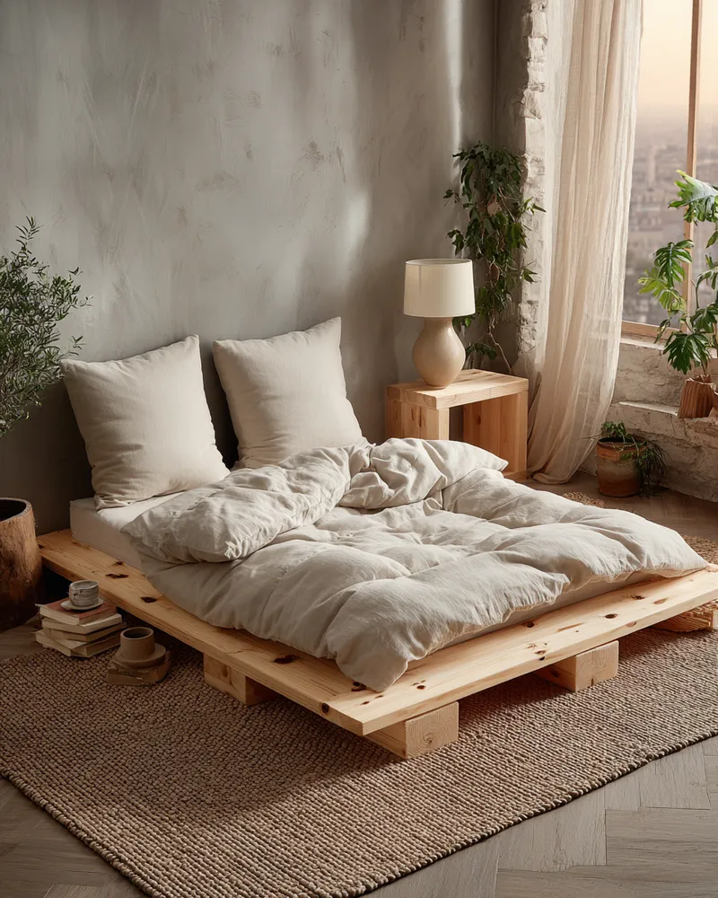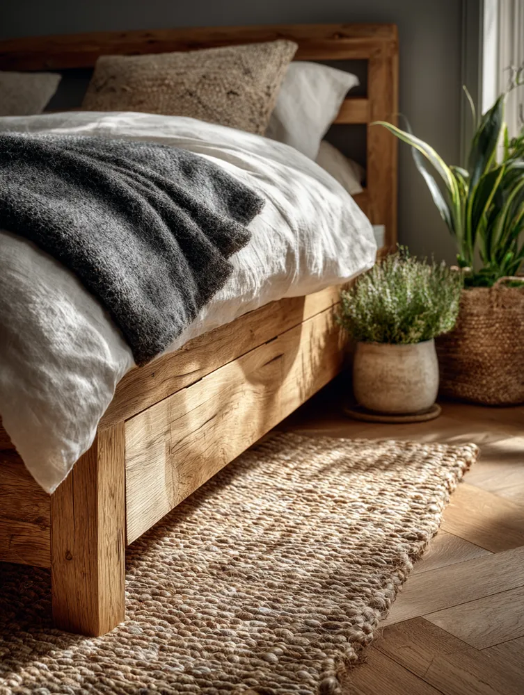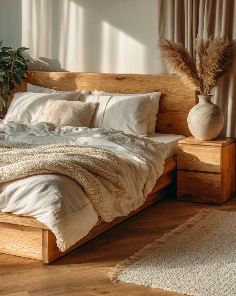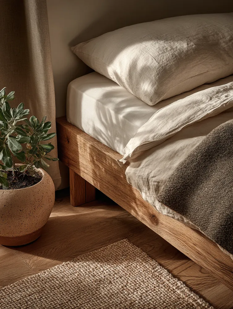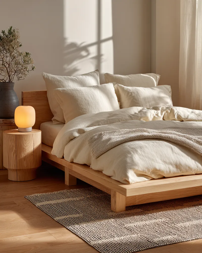 Think sustainable wood for your bed frame – perhaps light oak or ash. Bedding in natural fibers like linen or organic cotton in muted, calming hues (whites, creams, soft greys, earthy greens).