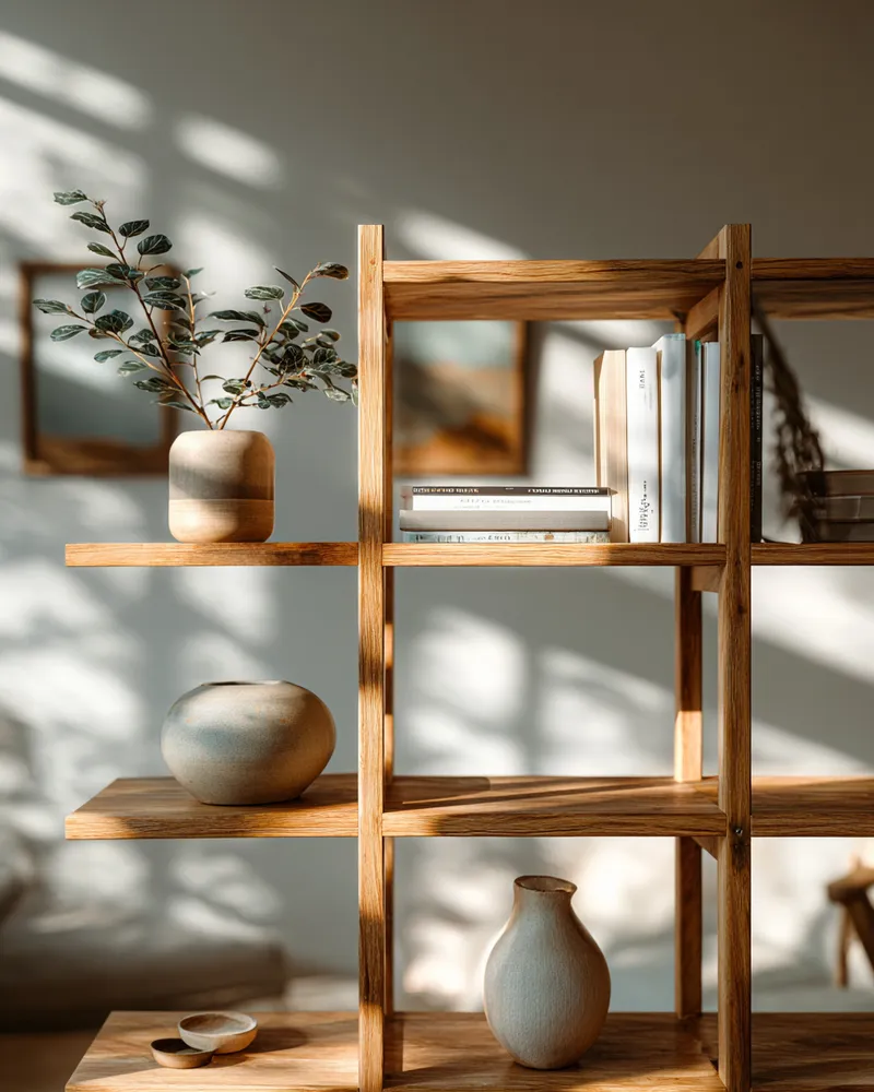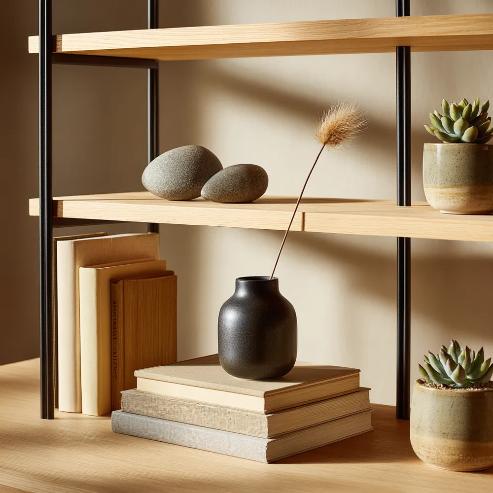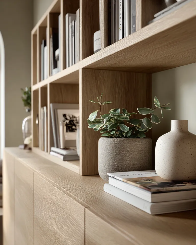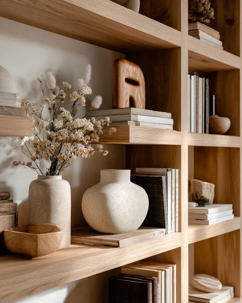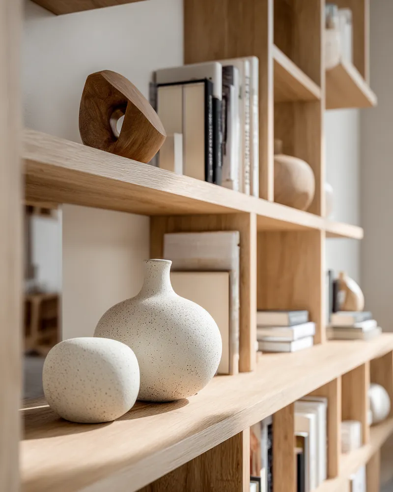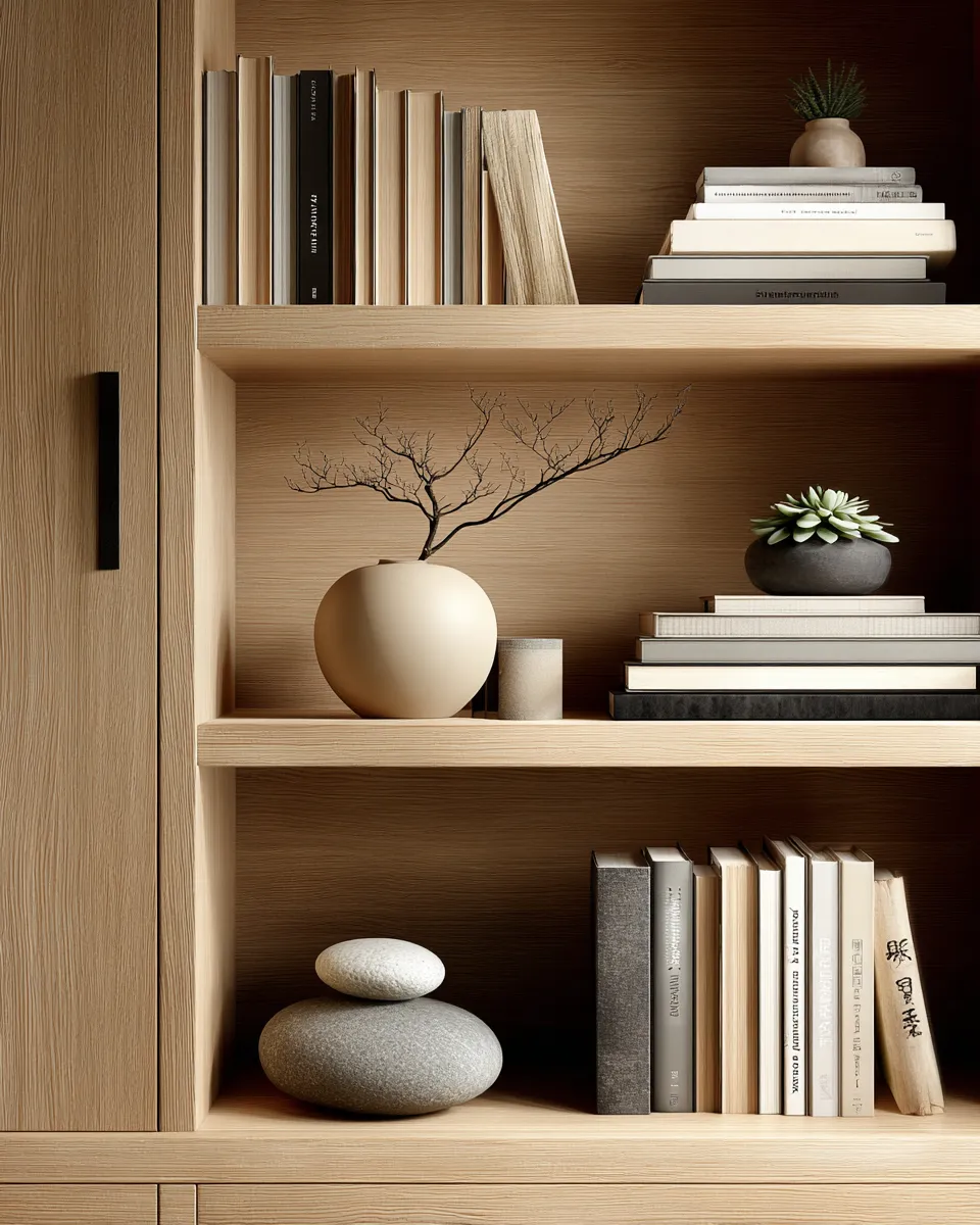 Styling a bookshelf in a Japandi home is about achieving a harmonious balance between order and aesthetic appeal. It’s not just about storage; it’s about creating visual tranquility.