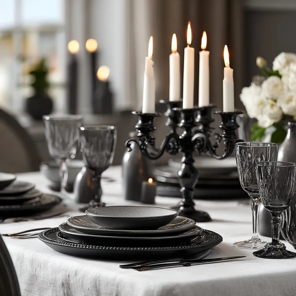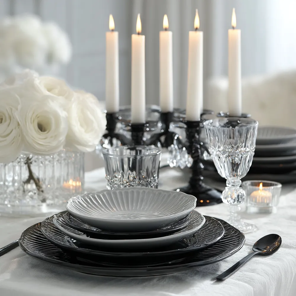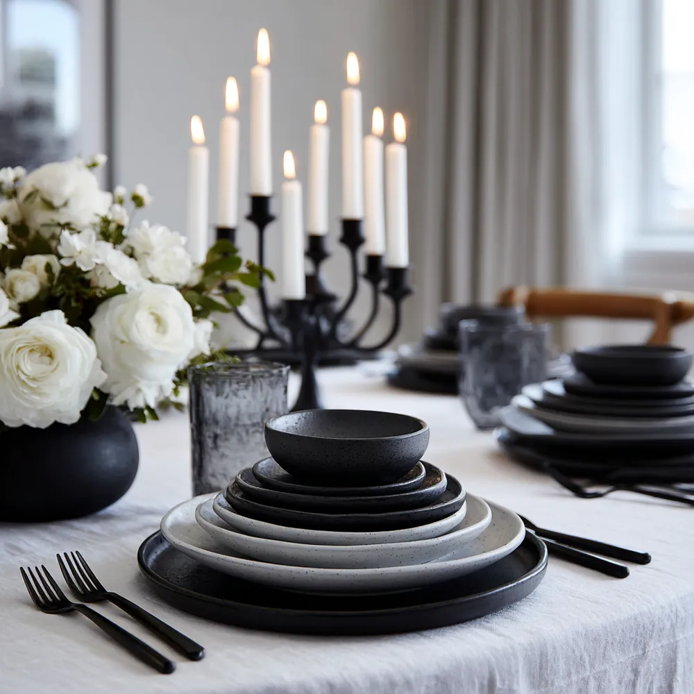 * **Monochrome Centerpiece:** Simple white ceramic vases or black candle holders create visual interest.