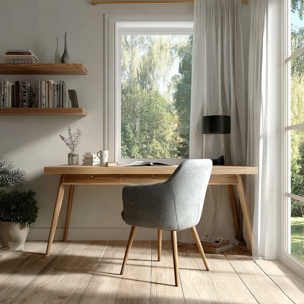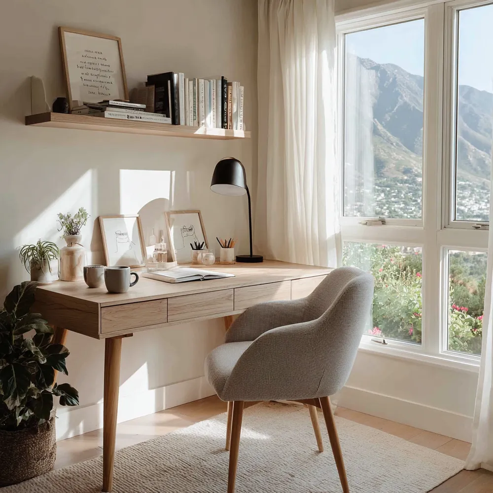 * **Strategic Lighting:** A modern black desk lamp and ample natural light.
