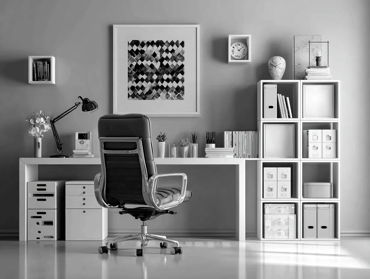 Create a workspace that inspires focus and sophisticated productivity with a monochrome palette. The balance of black, white, and grey can lead to a surprisingly calming yet invigorating environment.