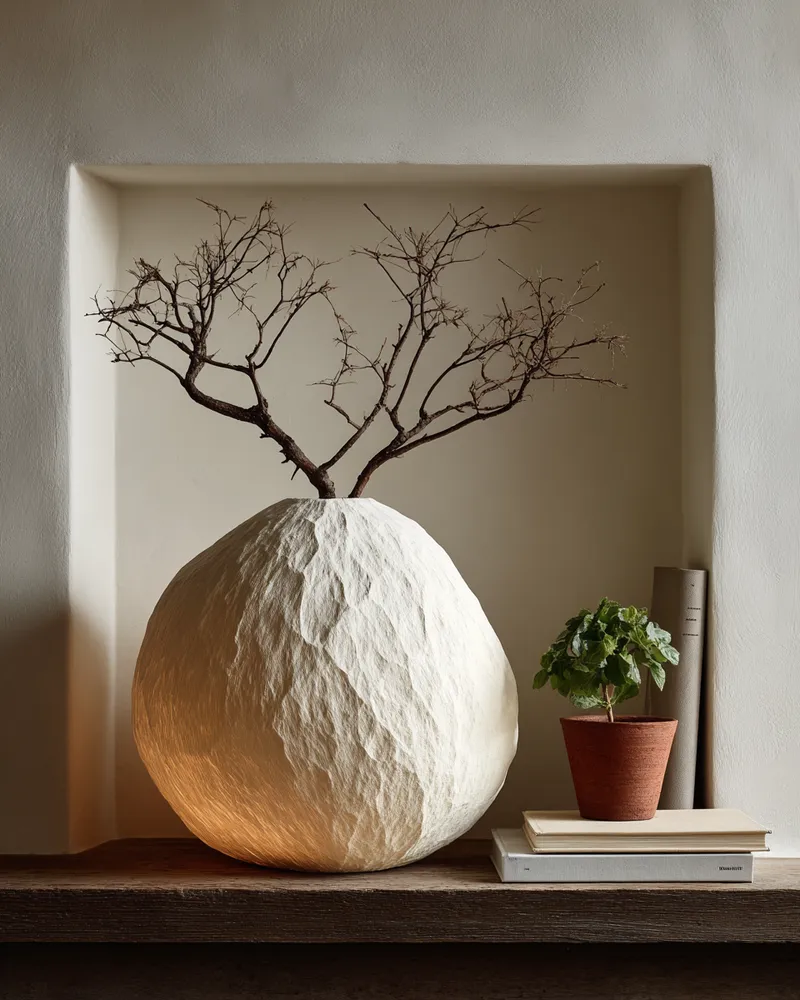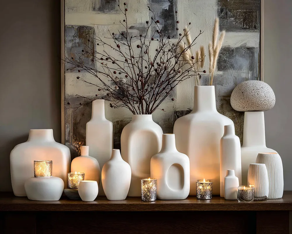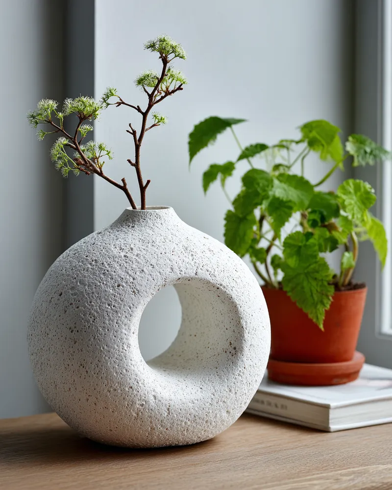 * **Sculptural Vases:** Opt for white ceramic or black geometric vases.
