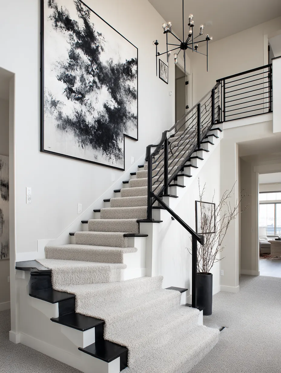 * **Monochrome Wall Art:** Create a gallery wall on an adjacent staircase wall with black and white prints.