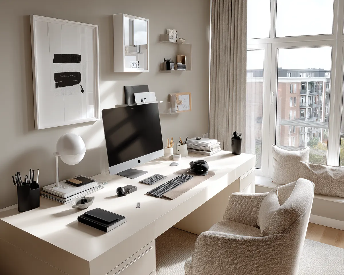 Elevate your workspace with a minimalist monochrome desk setup designed for ultimate focus and sophisticated style. The interplay of black, white, and grey promotes a clean, organized, and productive environment.