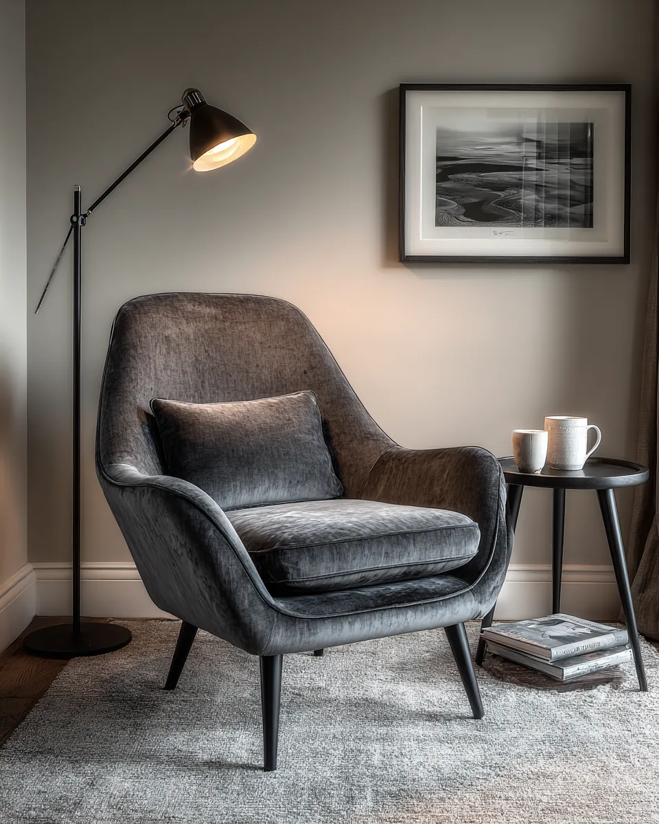 * **Comfortable Armchair:** A plush armchair in a charcoal grey or black fabric.