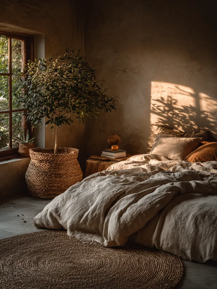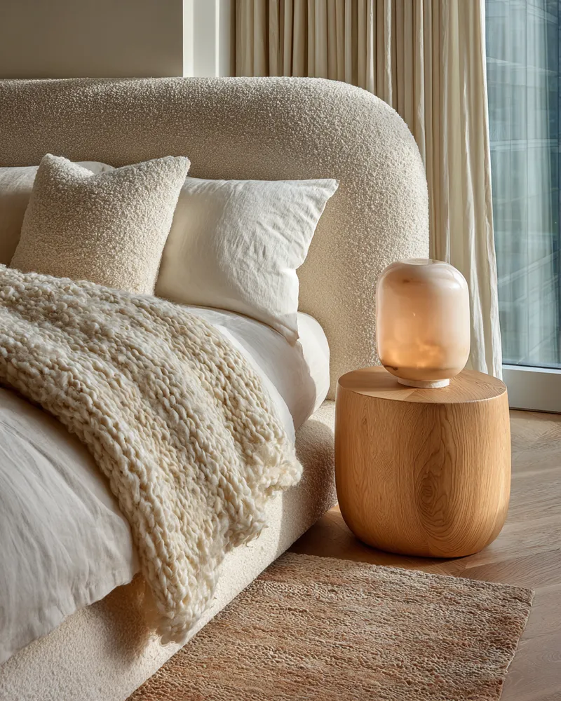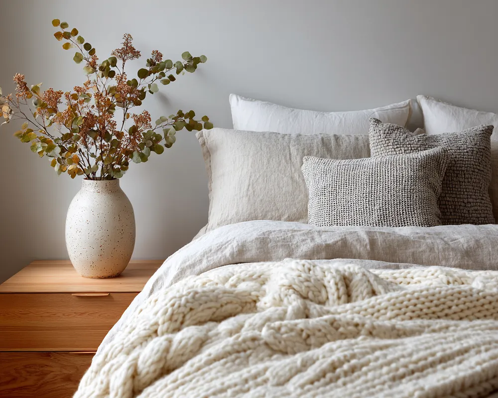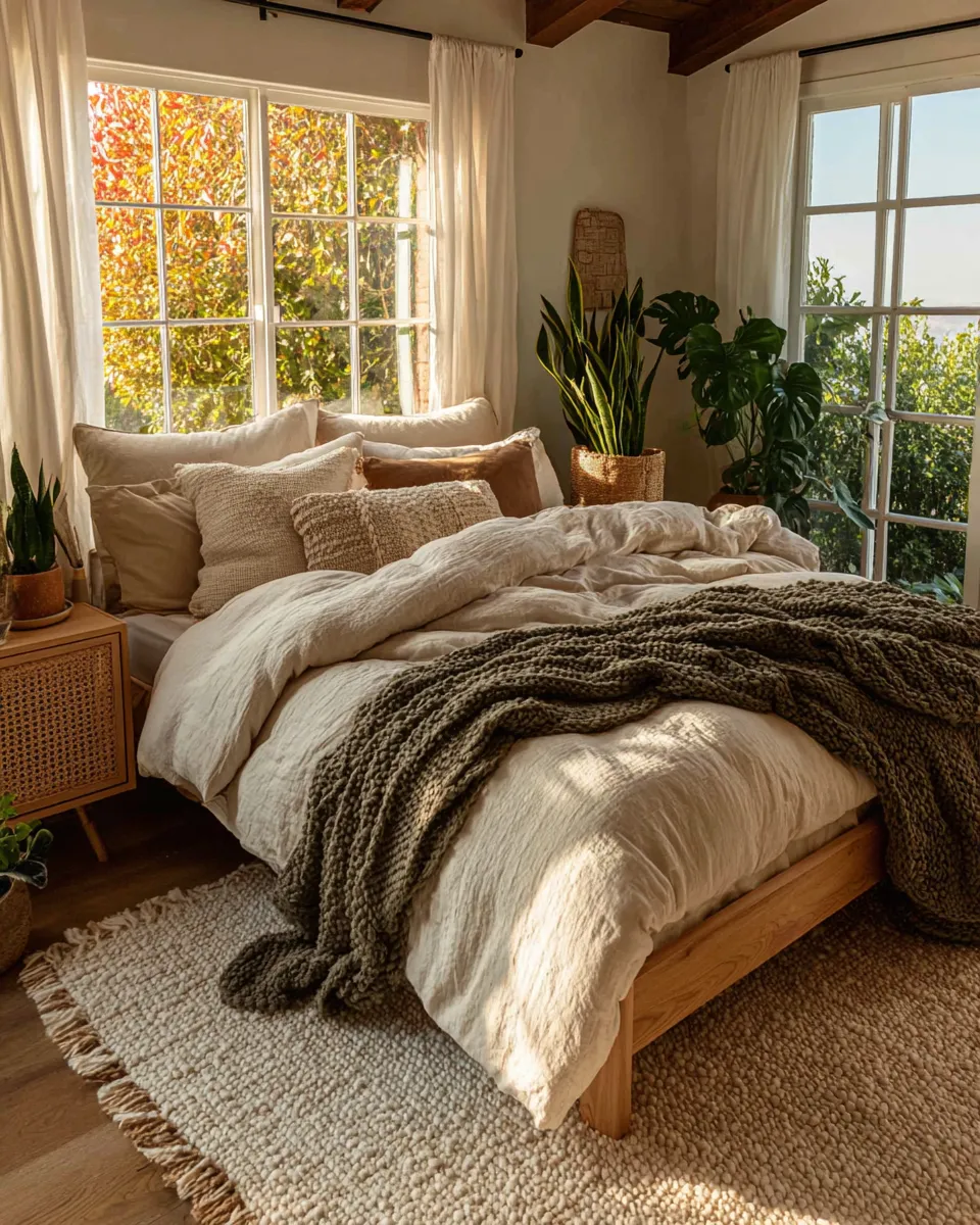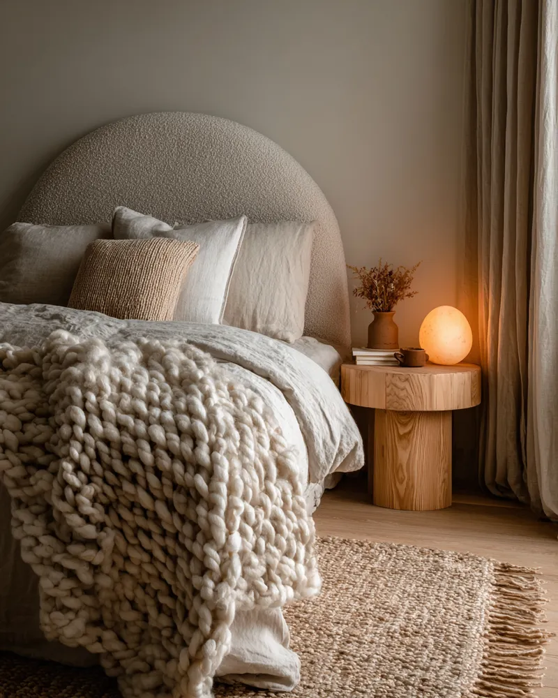 - **Comforting Textures**: Layered organic cotton bedding and a wool throw.