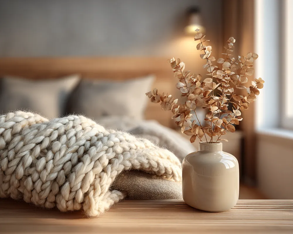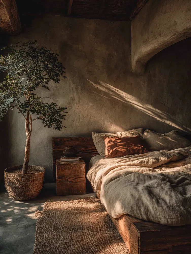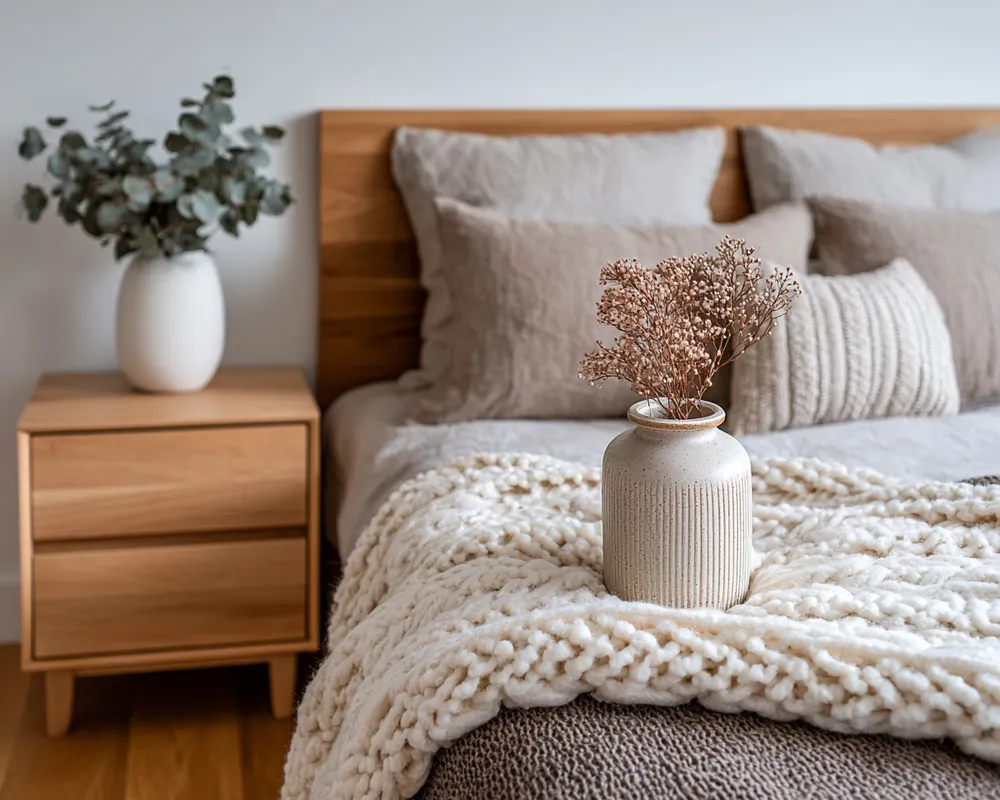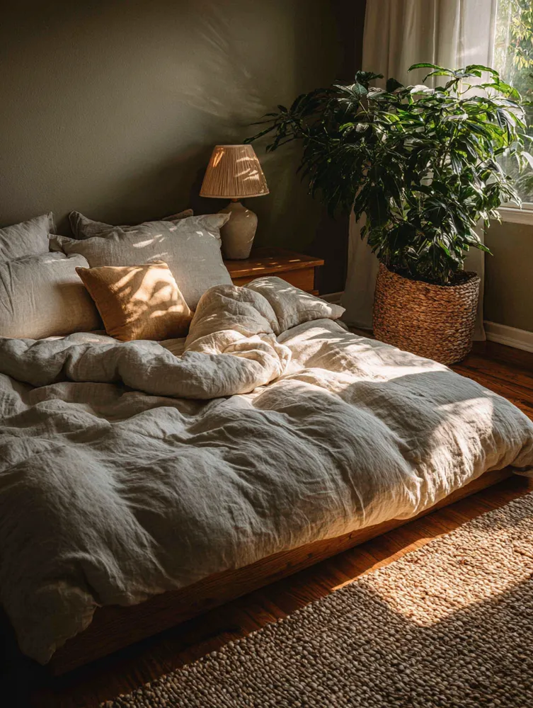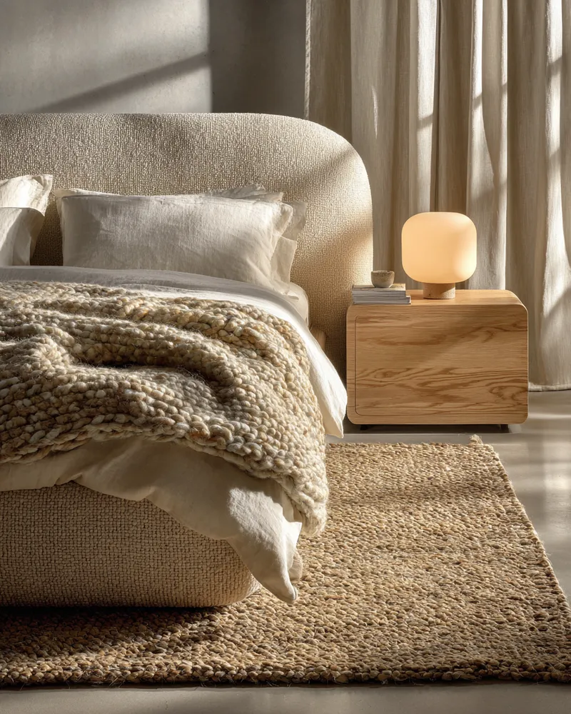 - **Comforting Textures**: Layered organic cotton bedding and a wool throw.