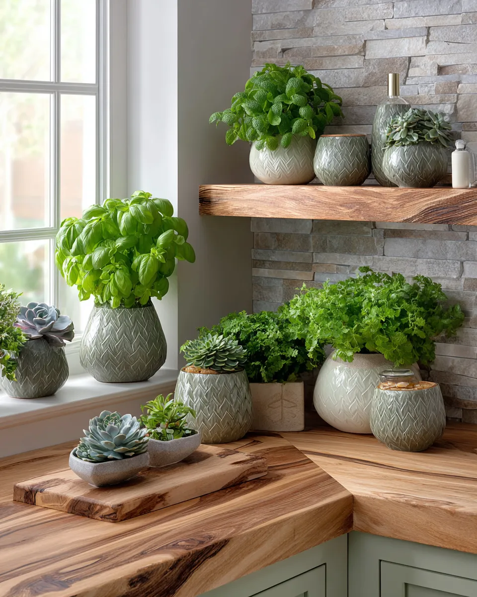 - **Stone & Ceramic**: A textured backsplash or ceramic planters.