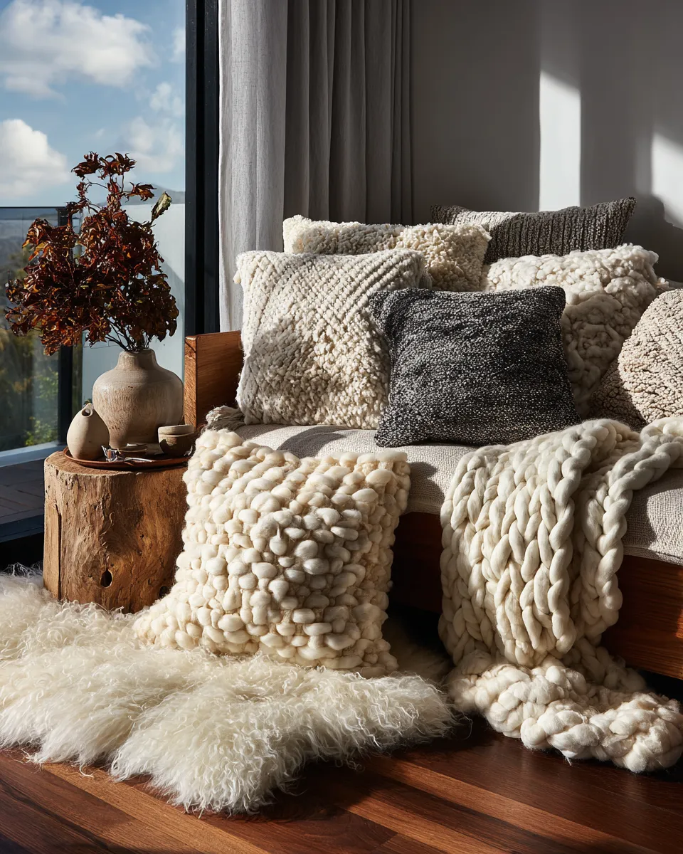 - **Wool**: Chunky knit throws and cozy area rugs. 🐑