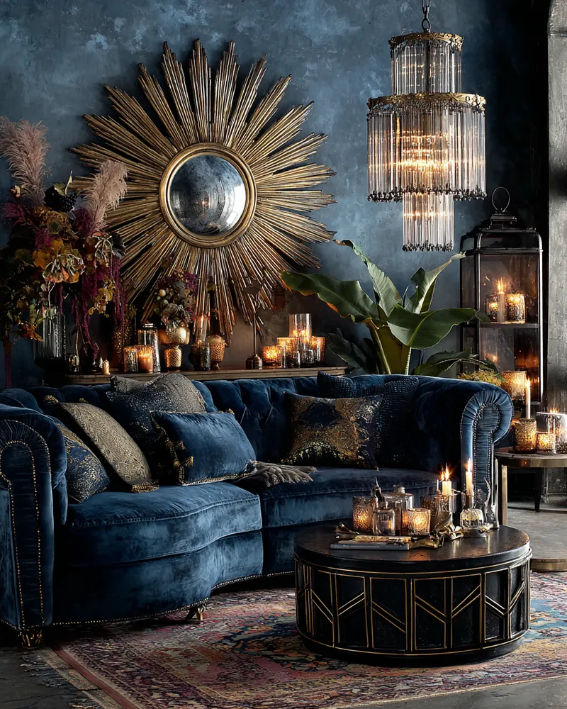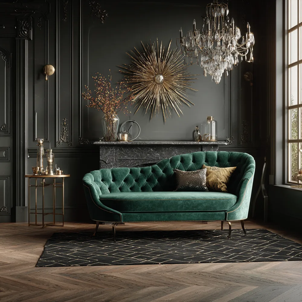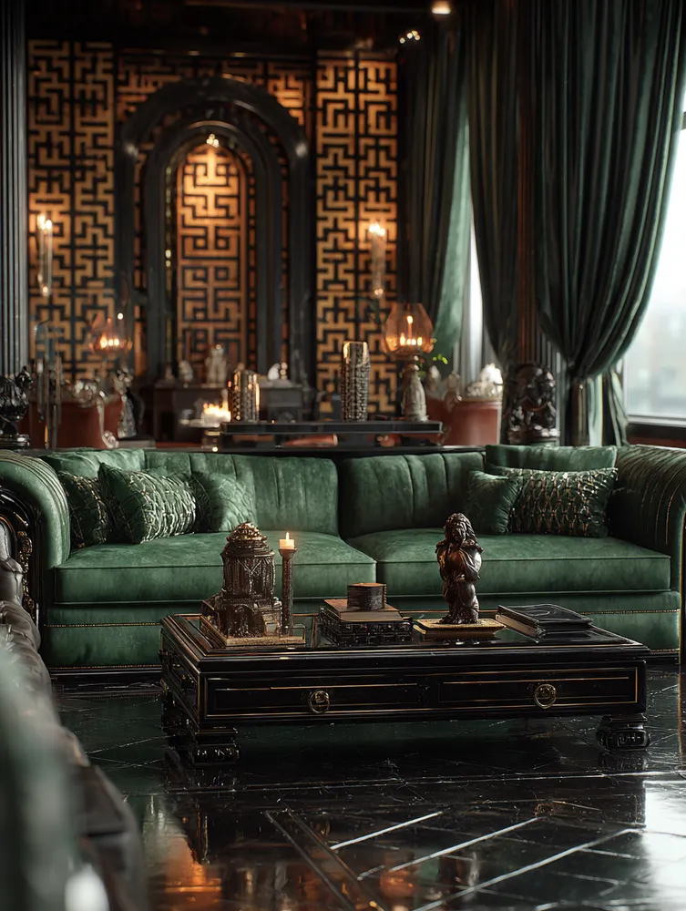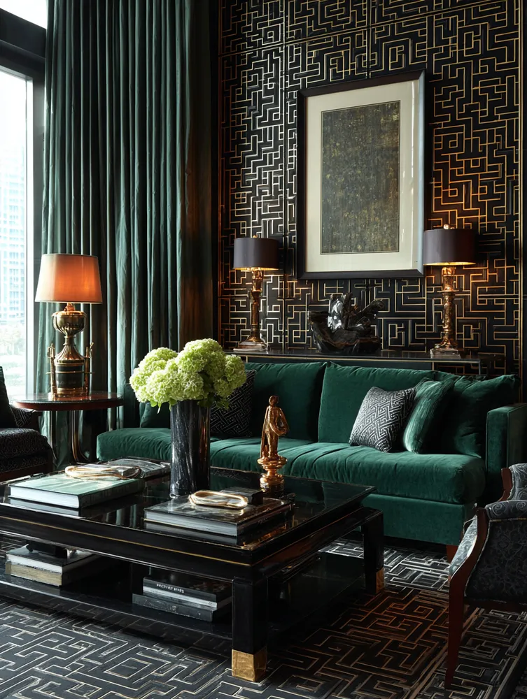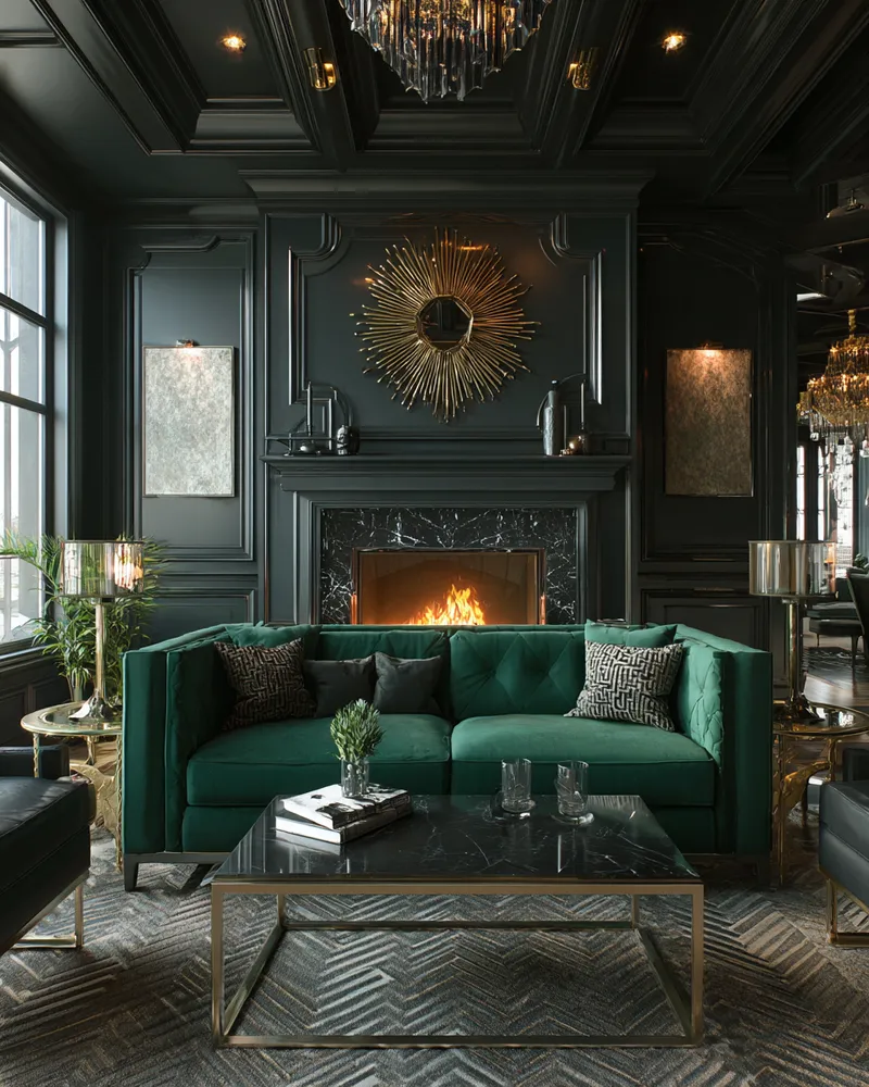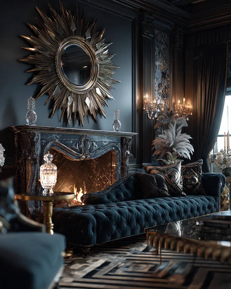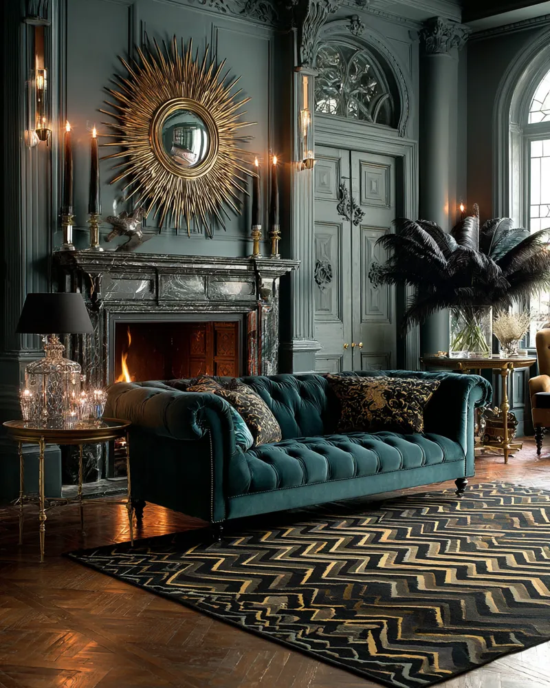 * **Luxurious Materials:** Incorporate brass, velvet, marble, and dark woods.