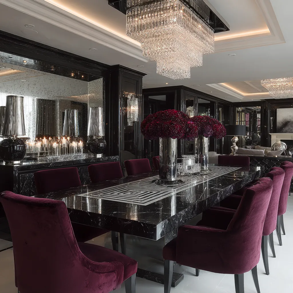 * **Bold Dining Table:** A marble-topped or dark wood table with geometric detailing.