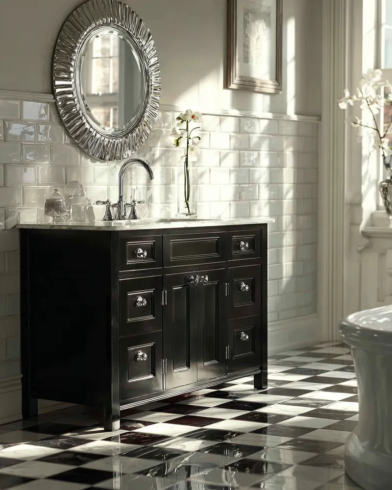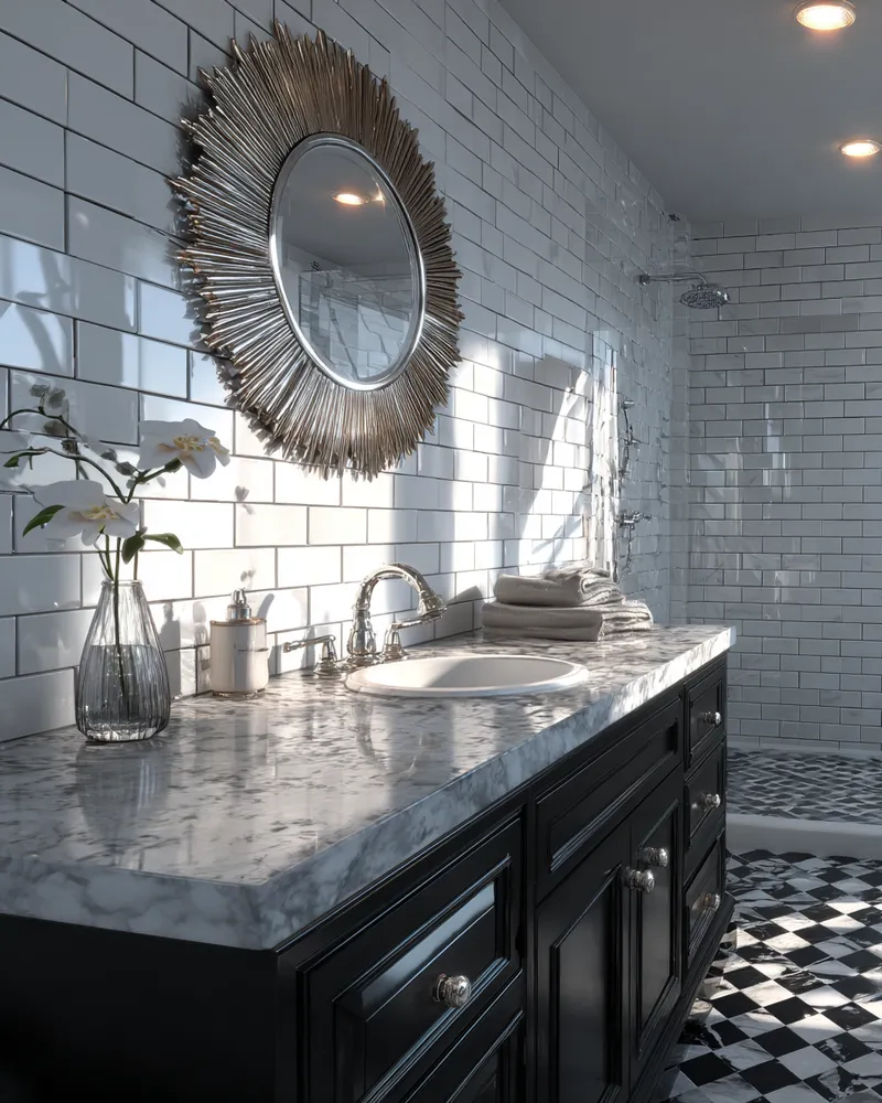 * **Statement Mirror:** An ornate, gilded, or geometric mirror above the vanity.
