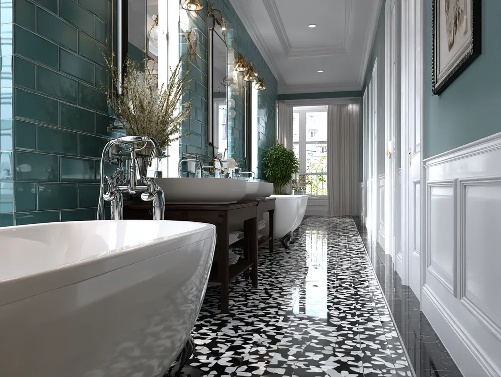 * **Brass or Chrome Fixtures:** Polished faucets, showerheads, and hardware.