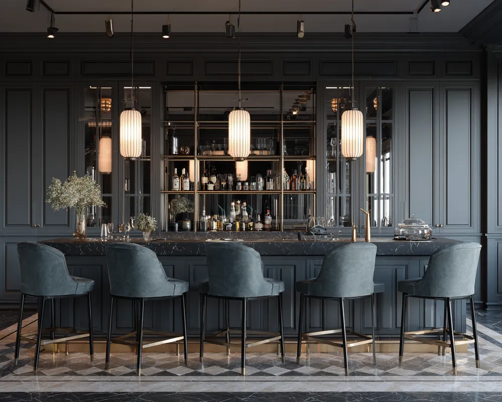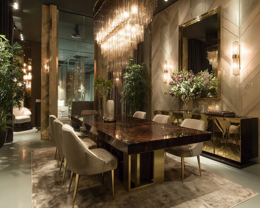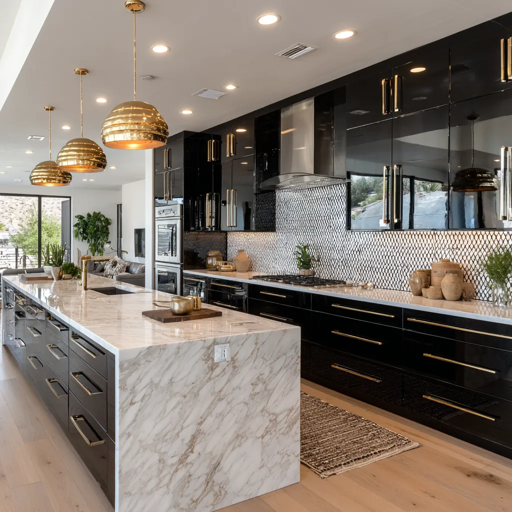 * **Sleek Cabinetry:** High-gloss finishes in dark woods or bold colors with brass or chrome hardware.