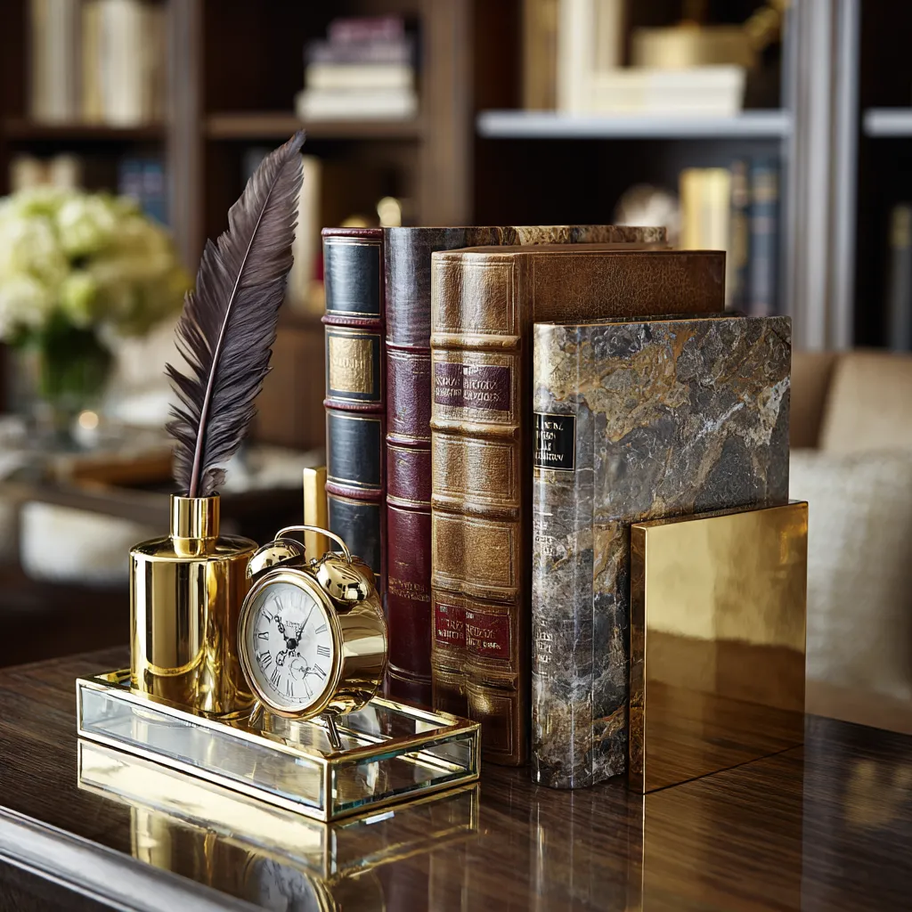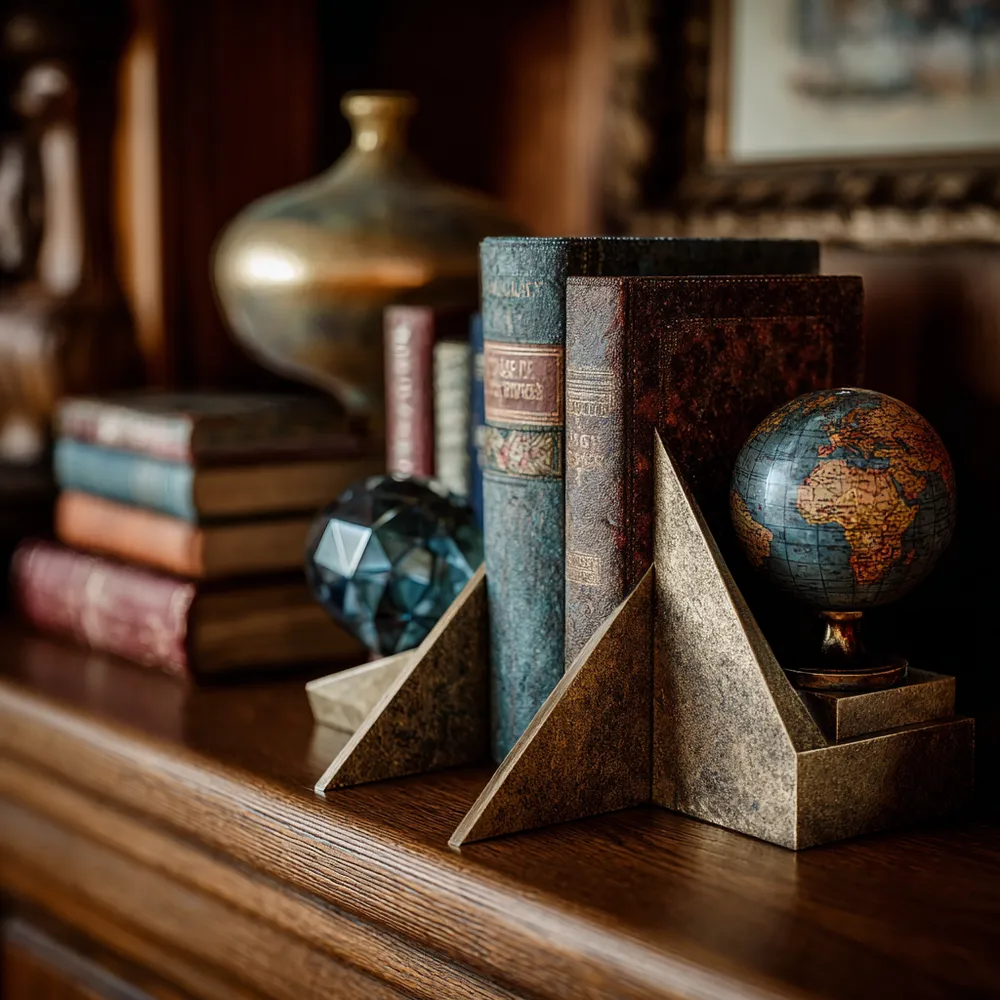 * **Geometric Bookends:** Look for brass, marble, or sculpted metal designs.