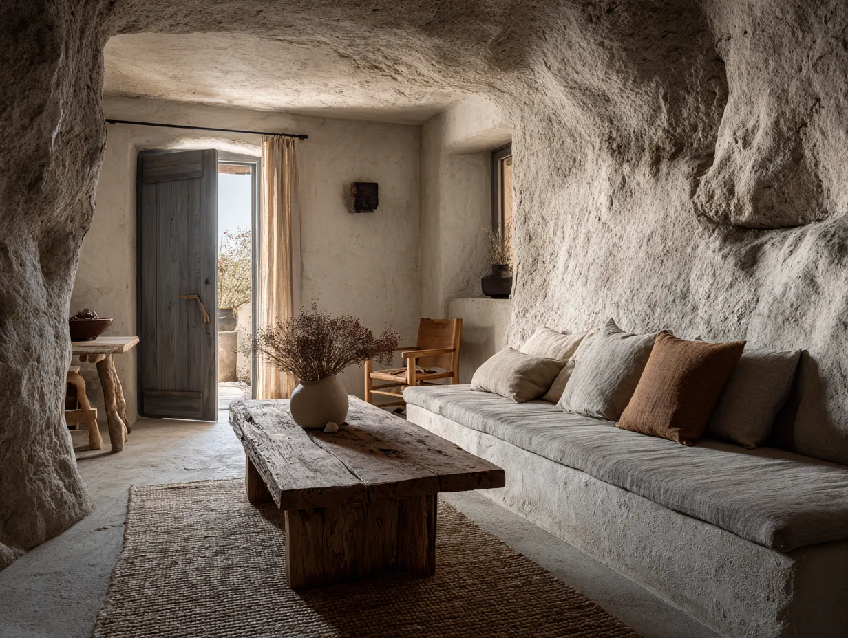 * **Natural & Patinated Materials:** Aged wood, unglazed ceramics, rough-hewn stone.
