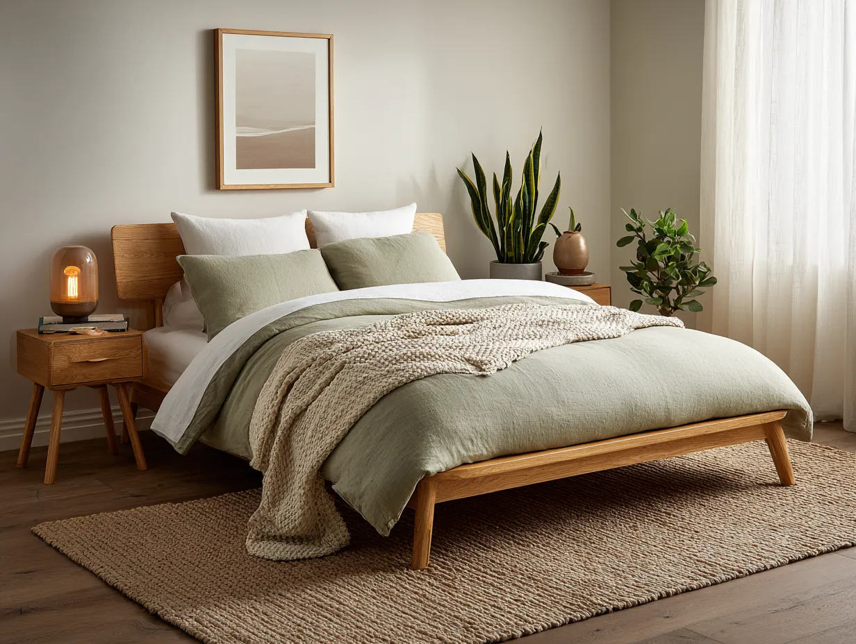 * **Minimalist Bed Frame:** Low-profile and made of natural wood.