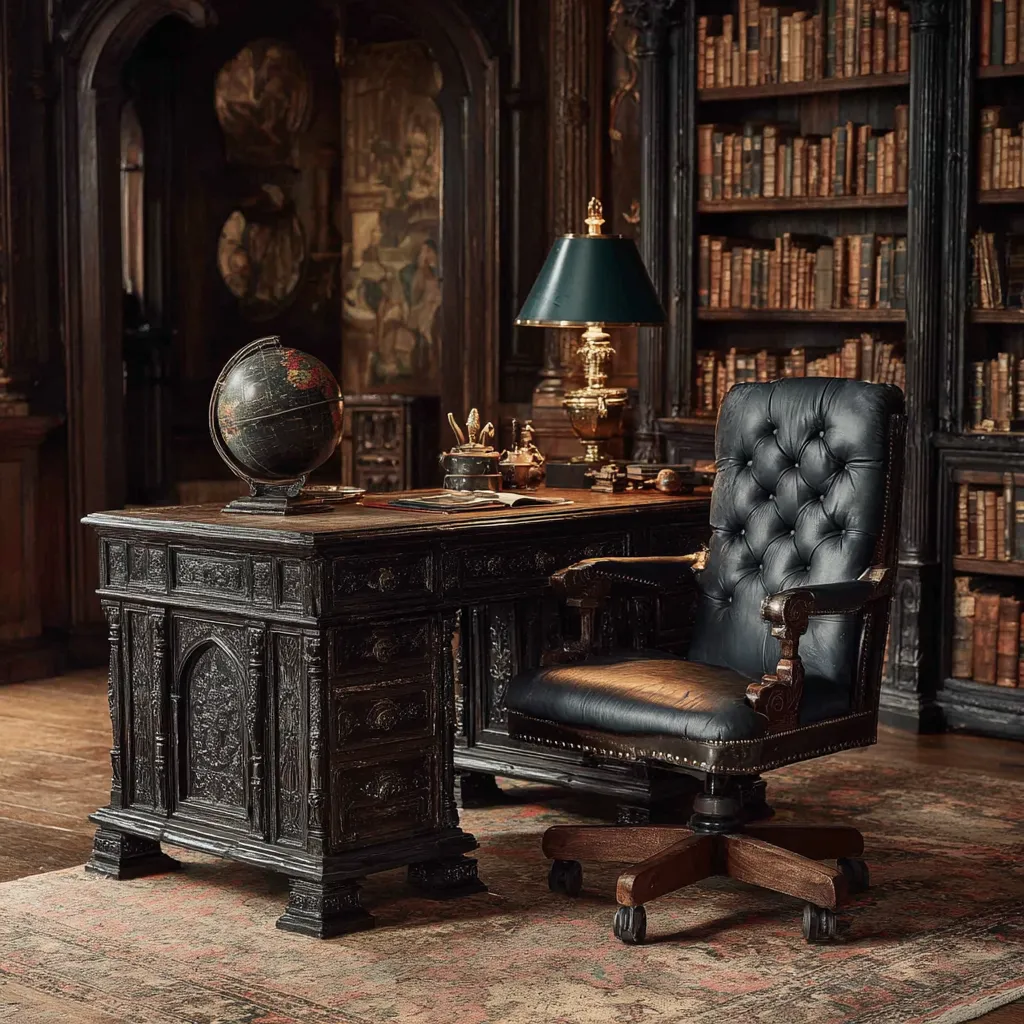 Create a workspace that inspires focus, creativity, and a sense of sophisticated gravitas. A Gothic home office blends historical charm with modern functionality. Imagine a grand, dark wood desk with ornate carvings, complemented by a plush, perhaps leather or velvet, executive chair. Shelving units filled with books and antique curiosities add character. Atmospheric lighting from a desk lamp and subtle ambient sources creates a mood conducive to deep work and contemplation. This is a space where productivity meets timeless elegance and a touch of the dramatic. ✨ Save this for your home office inspo! #GothicOffice#HomeOfficeIdeas#DarkWoodDesk#StudyInspiration#GothicWorkSpace#ProductivitySpace#ElegantOffice#VintageOffice#GothicInteriors#CreativeOffice