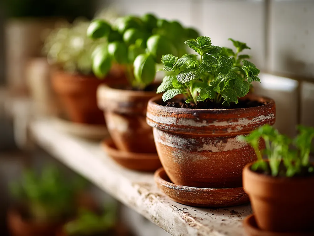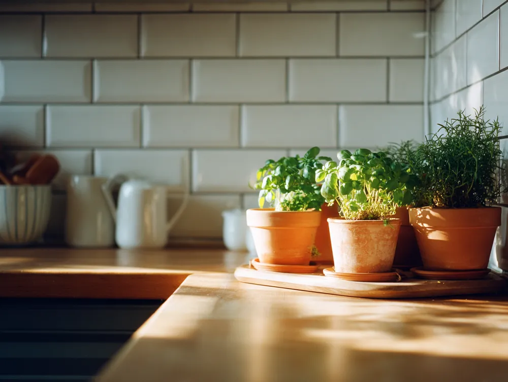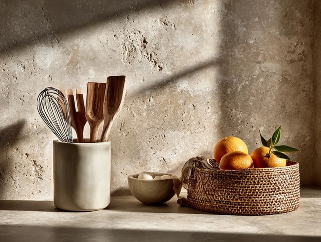 • **Ceramic Accents:** Matte finished ceramic utensil holders or pottery.