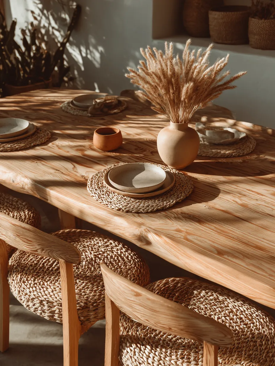 • **Natural Wood Table:** A solid wood dining table with a raw or matte finish.