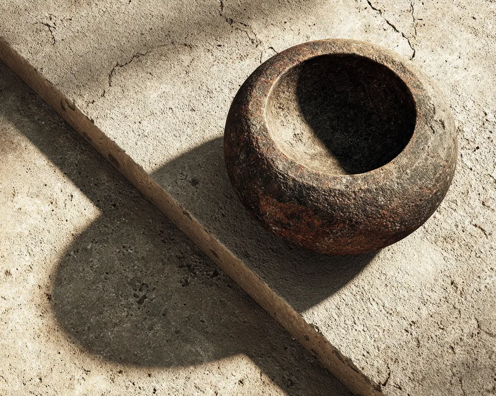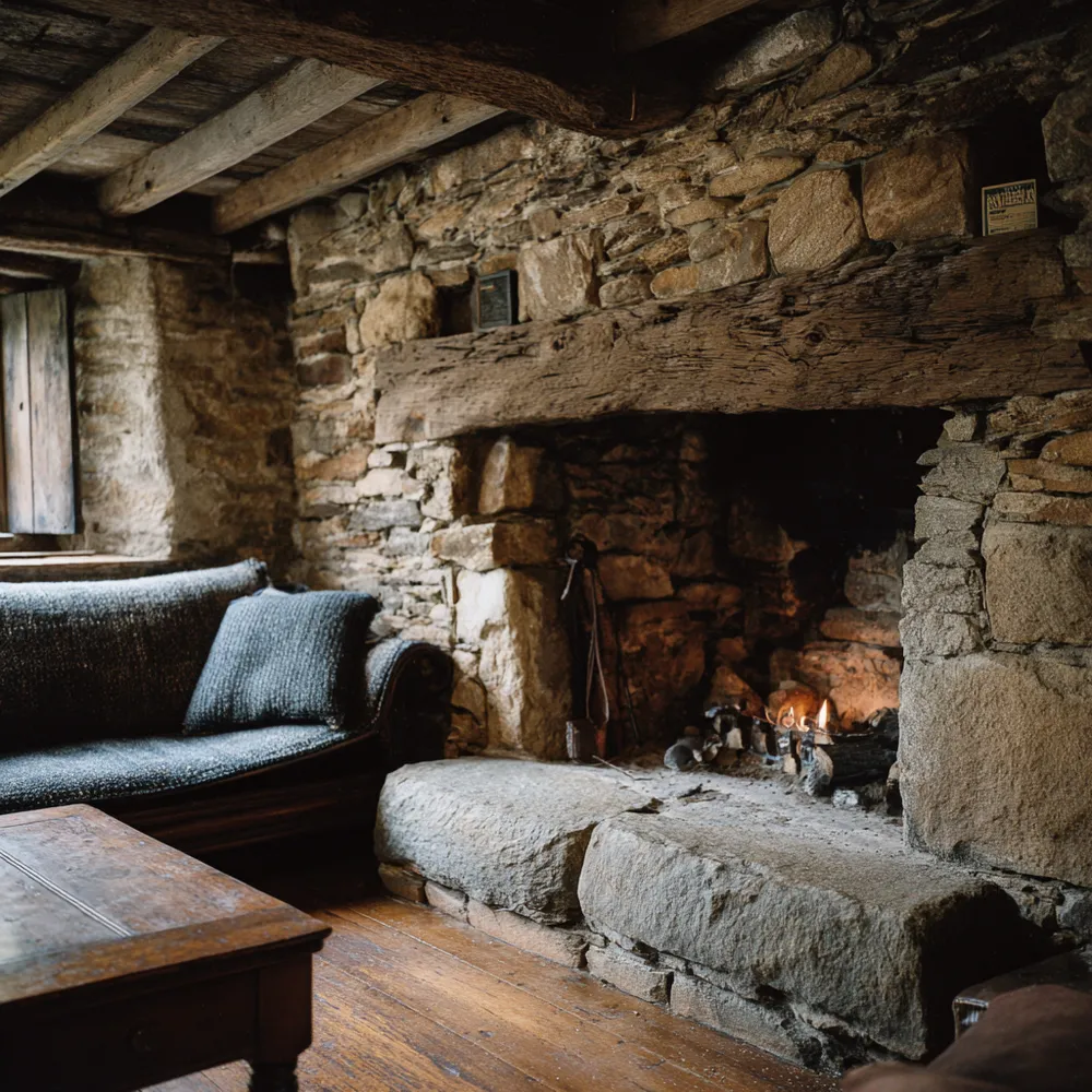 • **Bathroom:** A stone sink basin with a wooden vanity.