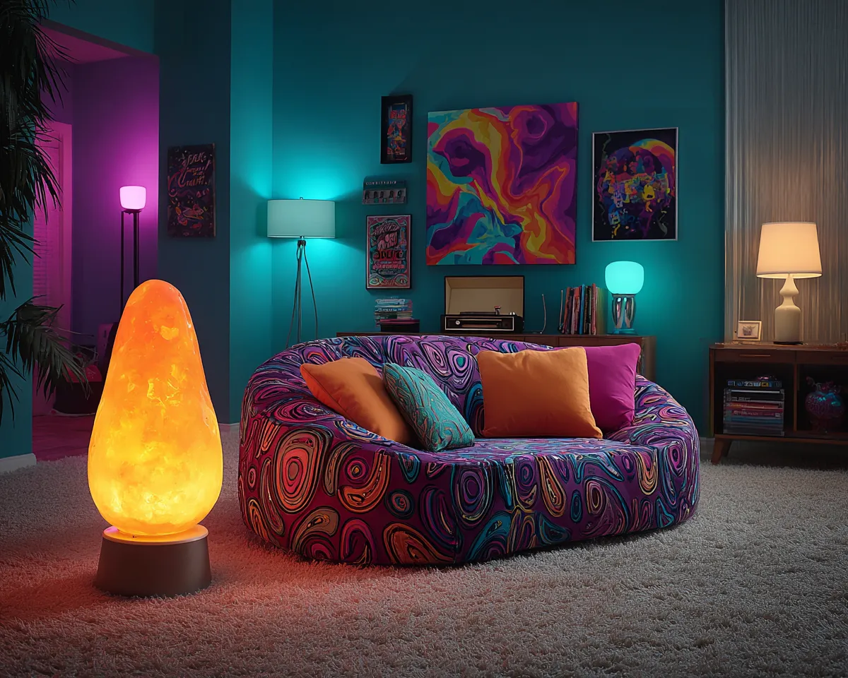 These elements can create a space that’s energetic, inspiring, and utterly unique. Perfect for a living room or creative studio! Save this for a burst of groovy inspiration! 🍄💫 #psychedelicdecorideas#60sstylehome#retrovibesdecor#boldpatterns#groovyhome#vintageinteriors#lavalamp#colorinspiration#uniquehome#statementdecor