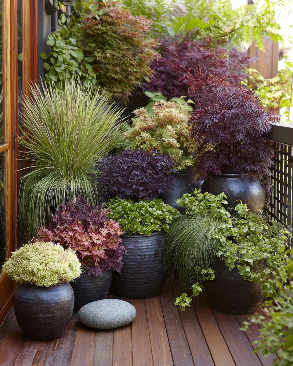 * **Vertical Layers:** Use tiered planters or hanging baskets to maximize space and create dimension.