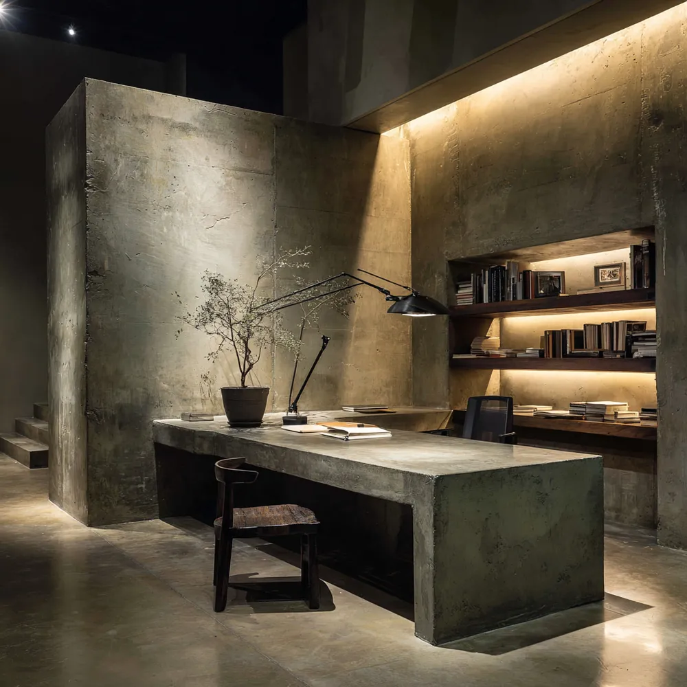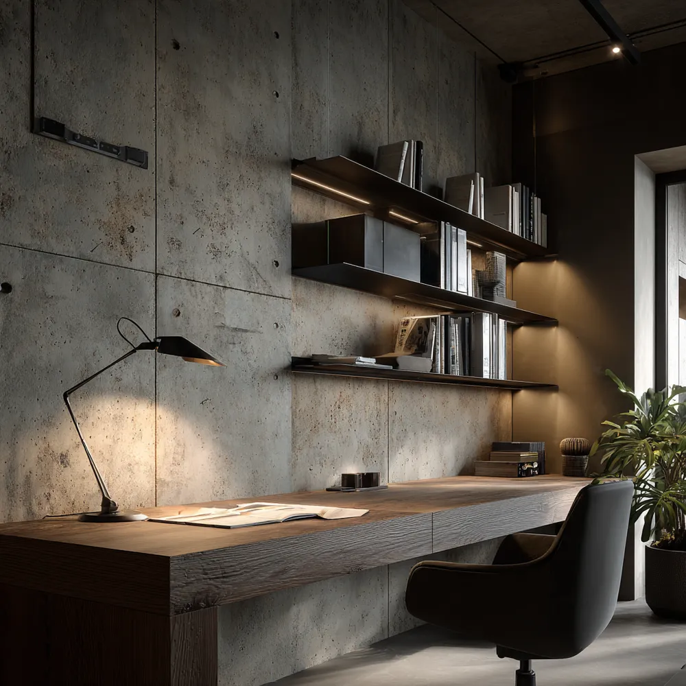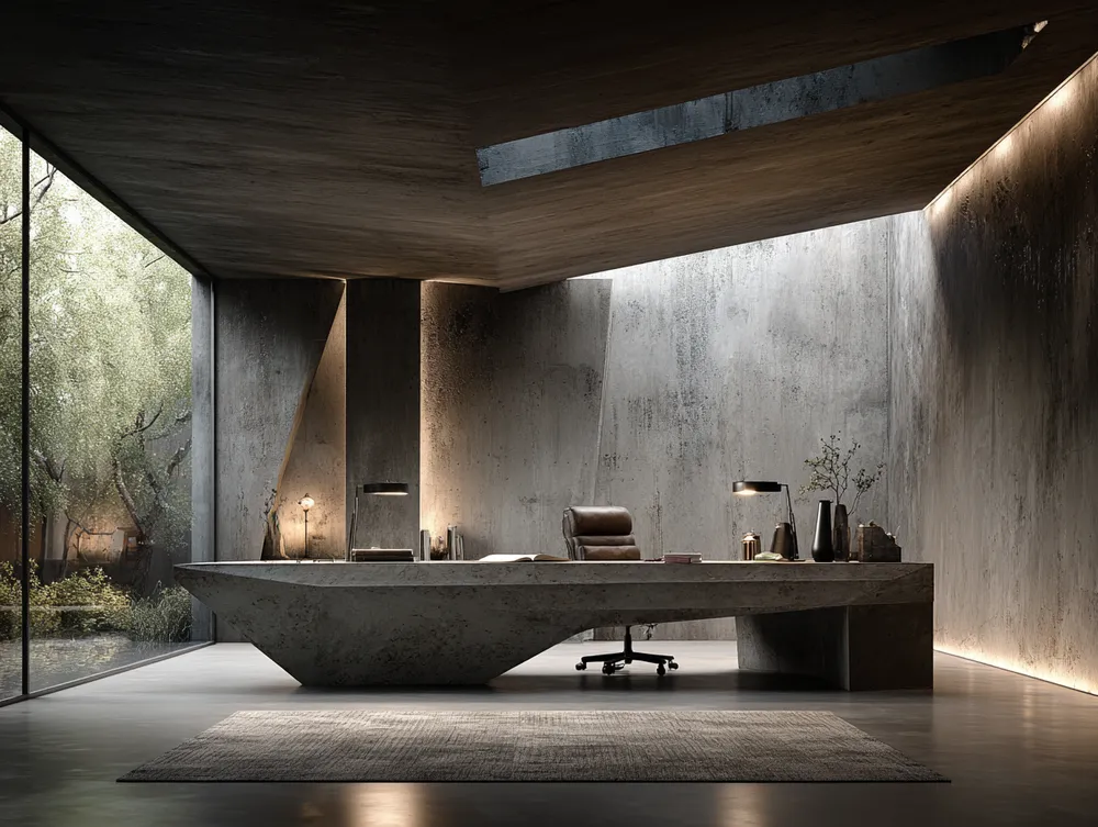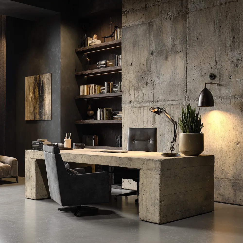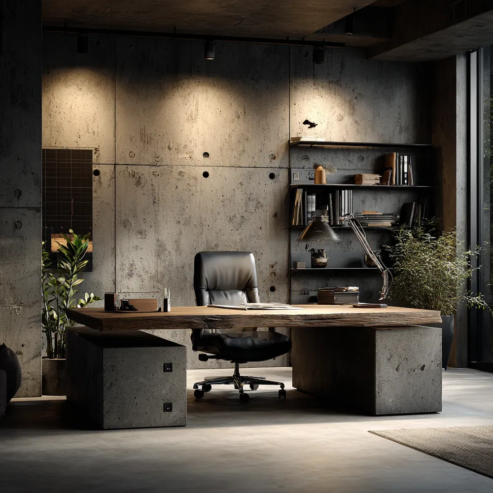 Consider raw concrete walls or desk surfaces, complemented by furniture with strong geometric silhouettes. The emphasis is on material honesty and solid forms.