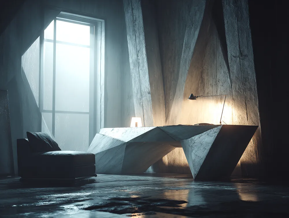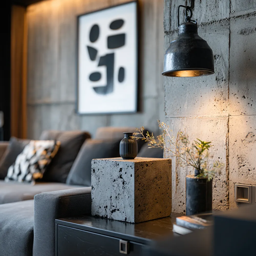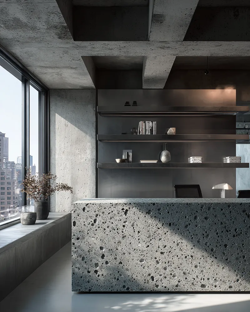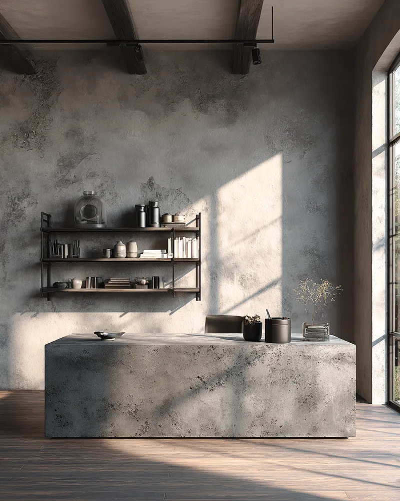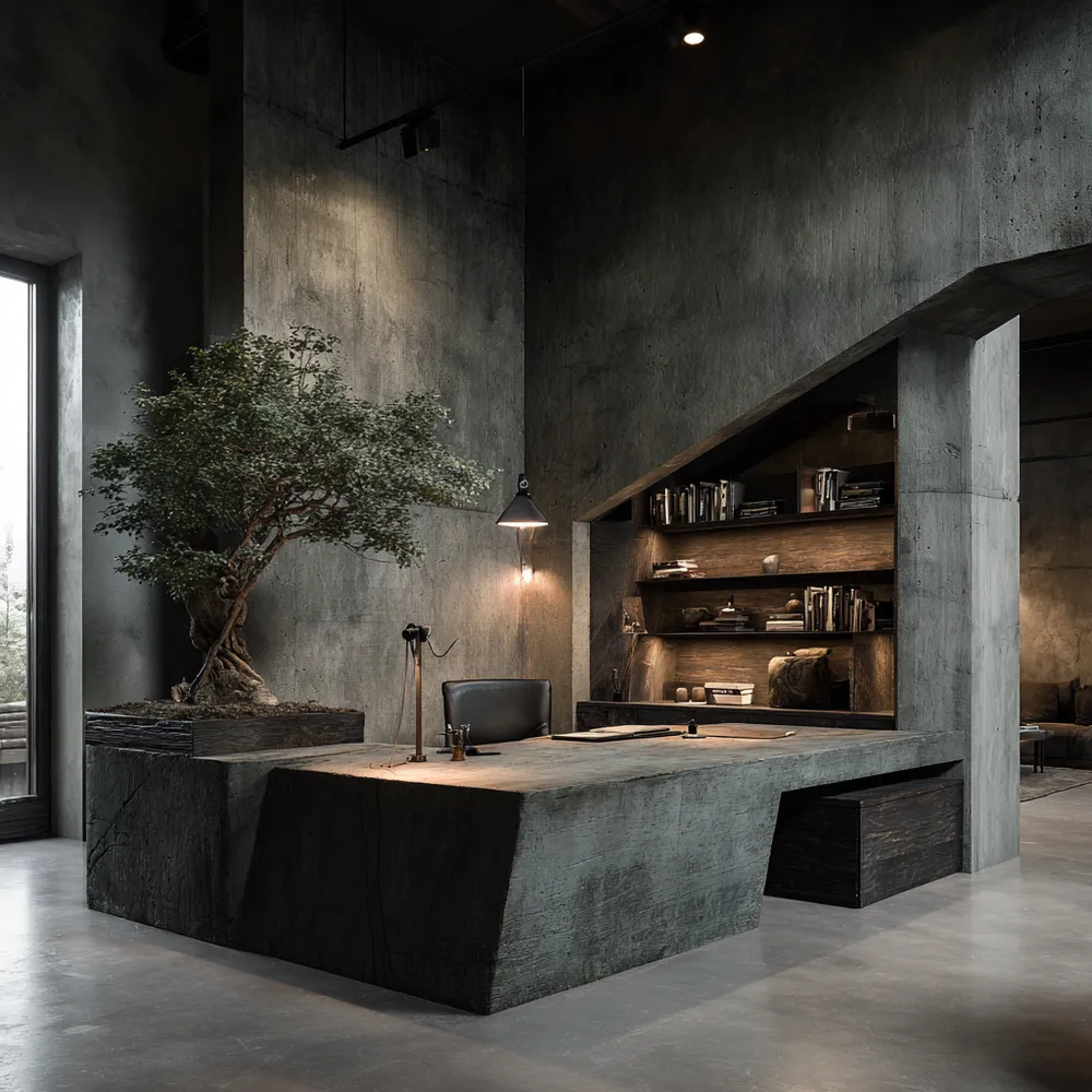 Consider raw concrete walls or desk surfaces, complemented by furniture with strong geometric silhouettes. The emphasis is on material honesty and solid forms.