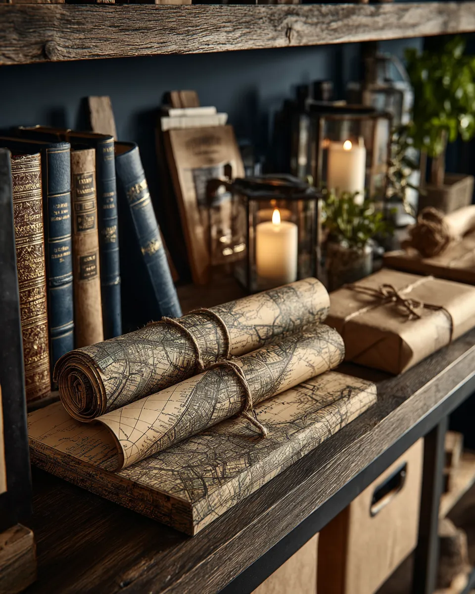 • Rolled & Tied: Elegantly roll maps and tie with leather or twine, displayed on shelves or tables.