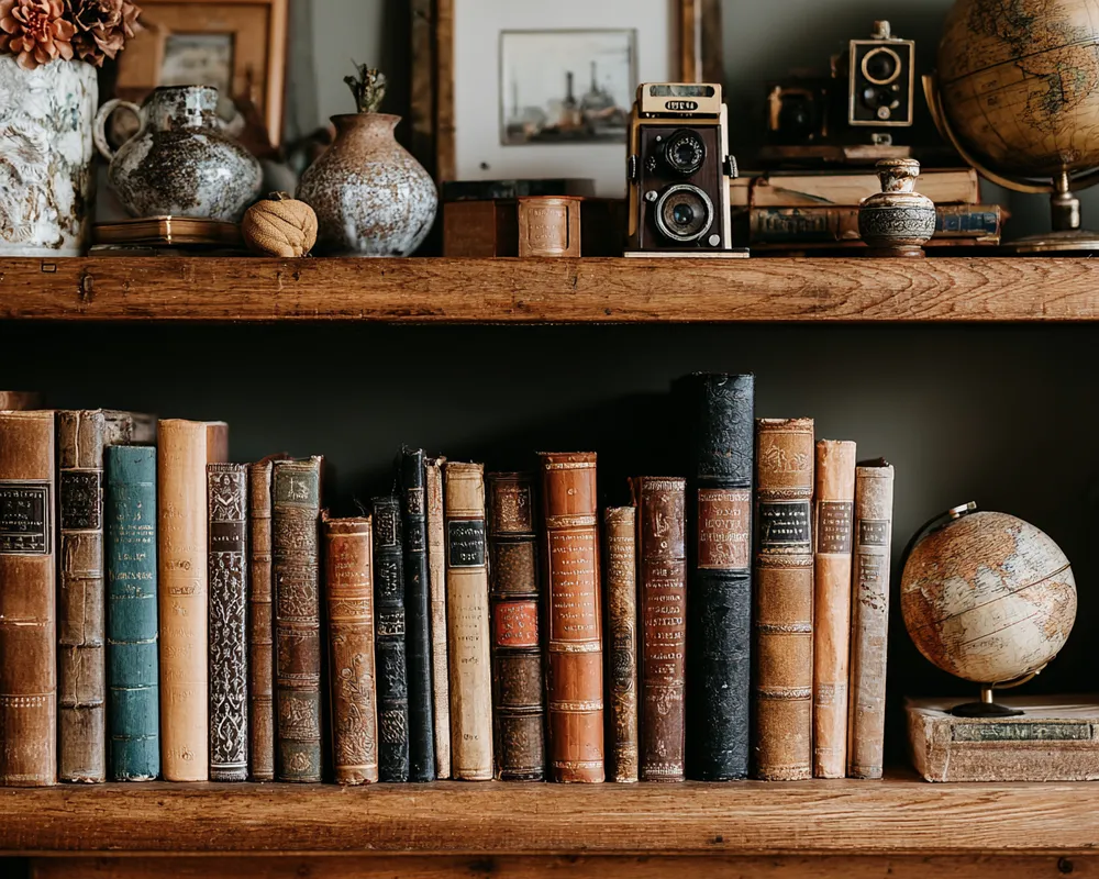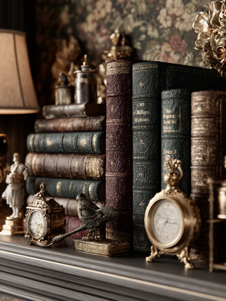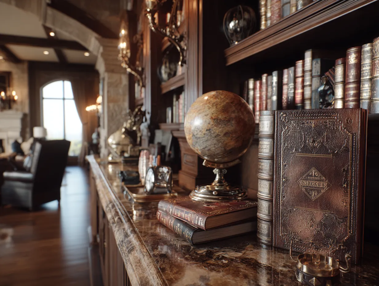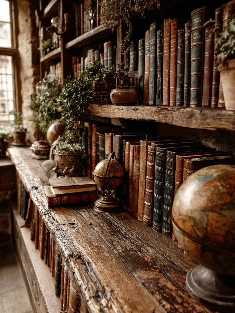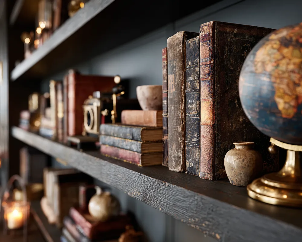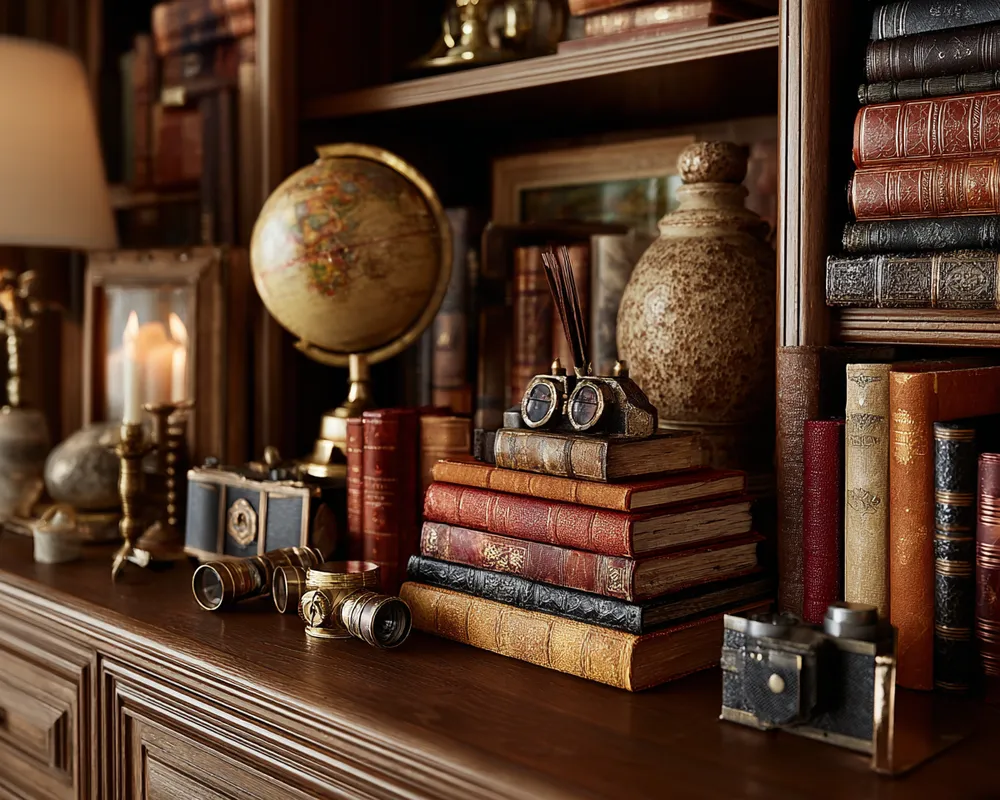 • Accents: Pair books with literary-themed curiosities like inkwells, globes, or vintage globes.