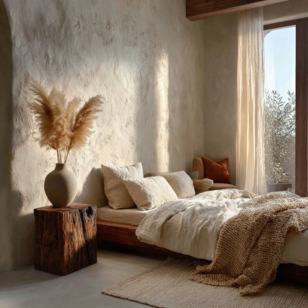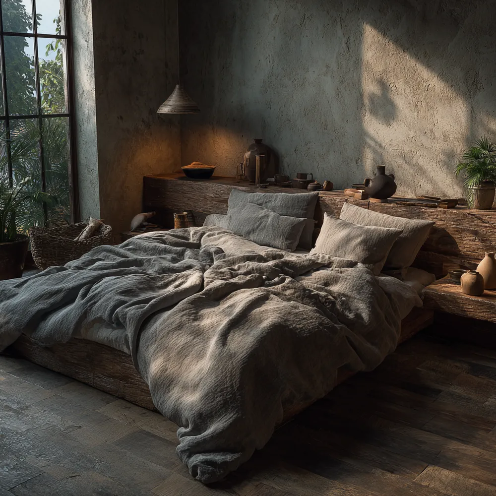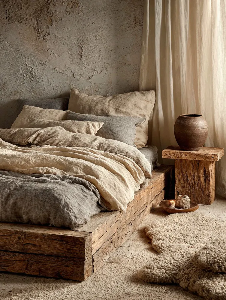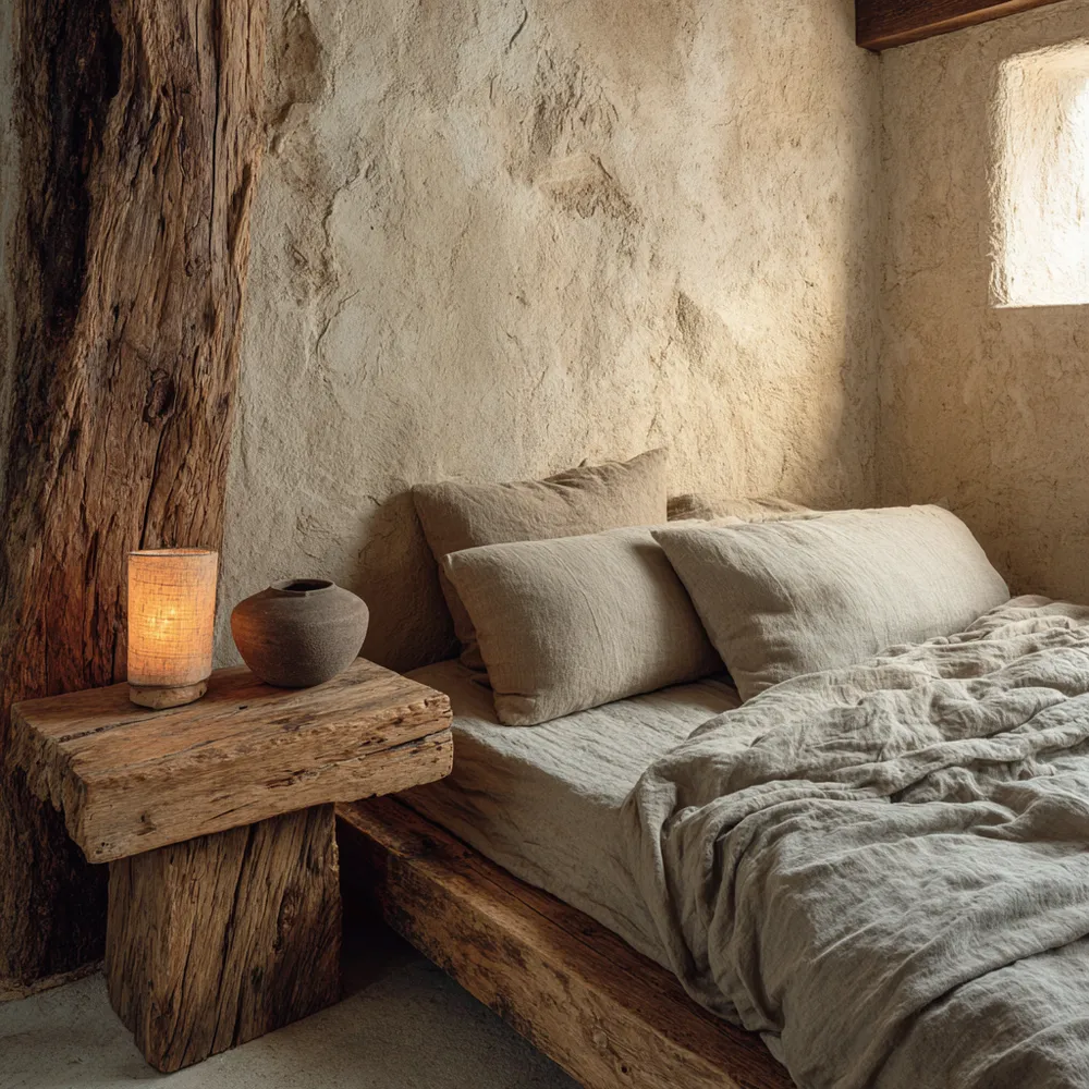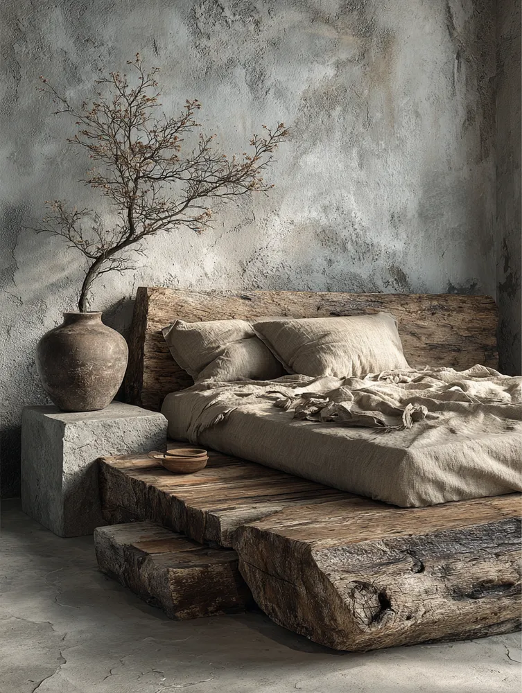 Create a bedroom that whispers serenity and embraces the beauty of imperfection, à la Wabi-Sabi. This design philosophy is about finding peace in the simple, the natural, and the aged.
