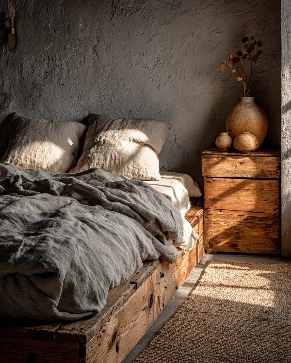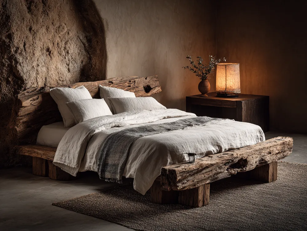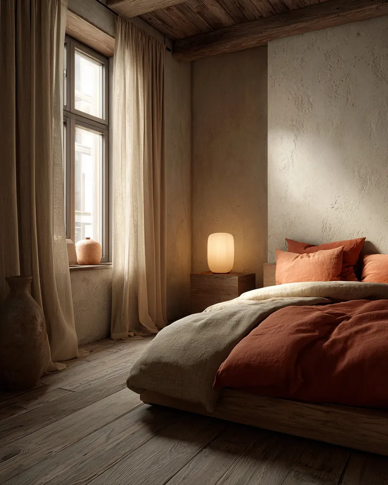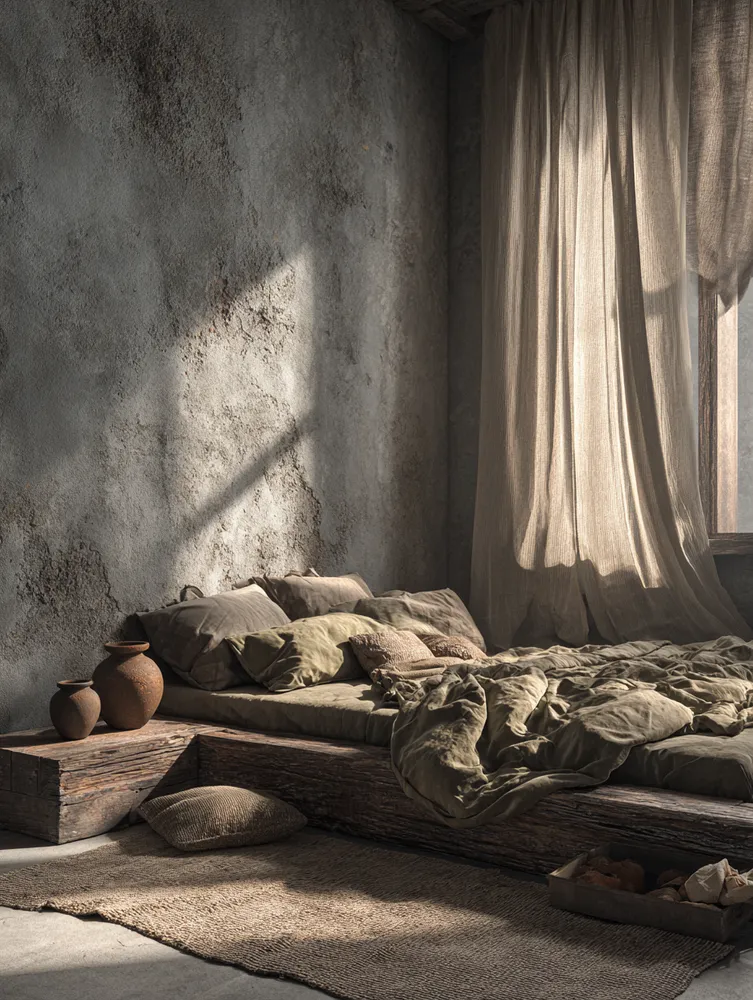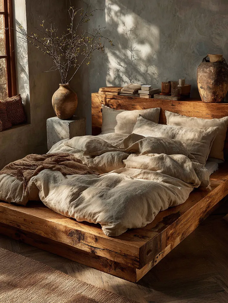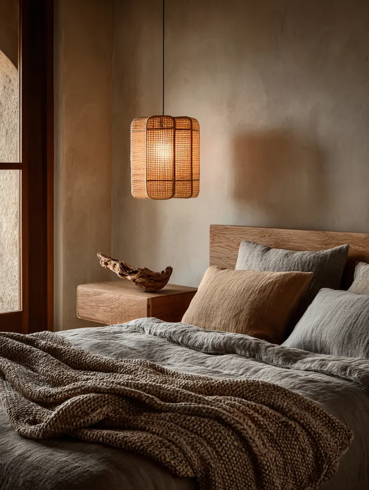 Create a bedroom that whispers serenity and embraces the beauty of imperfection, à la Wabi-Sabi. This design philosophy is about finding peace in the simple, the natural, and the aged.