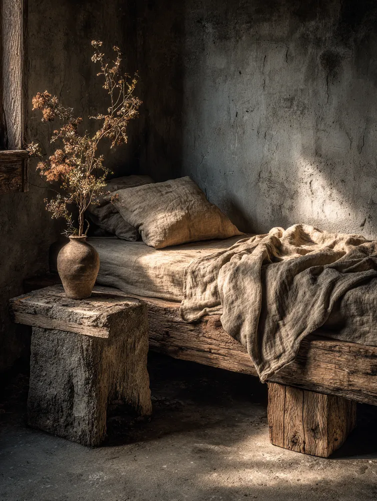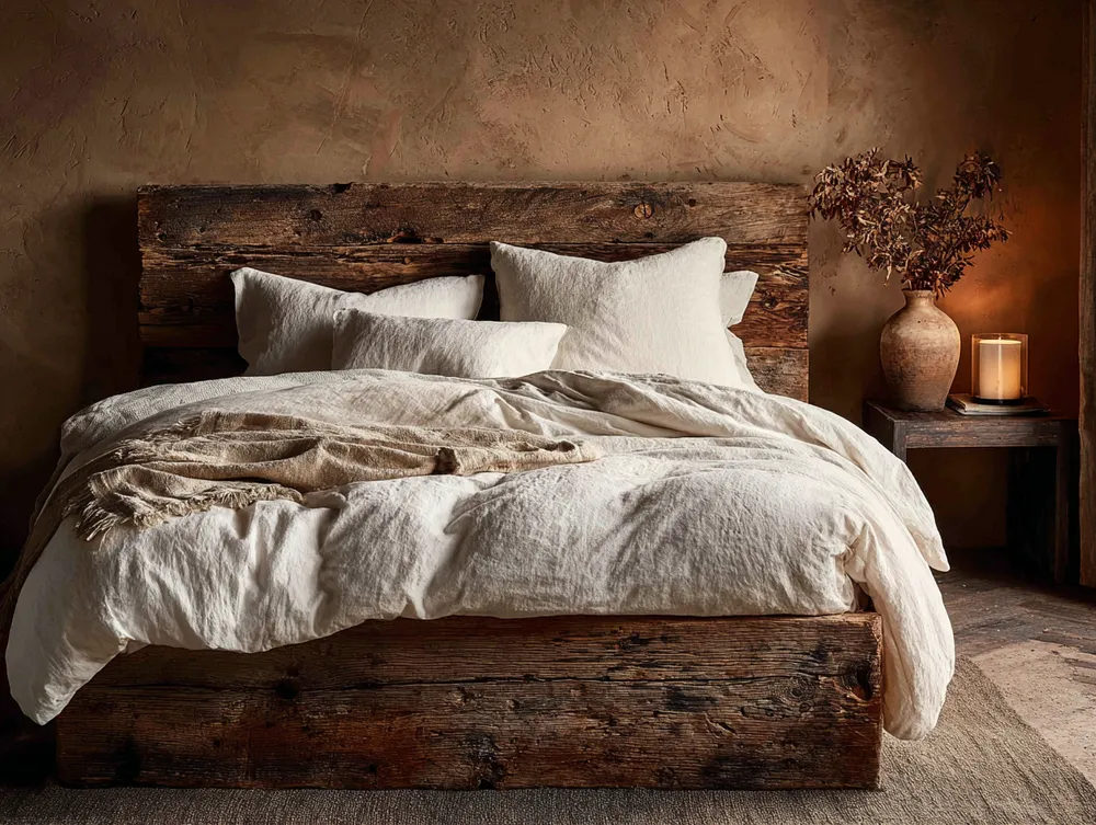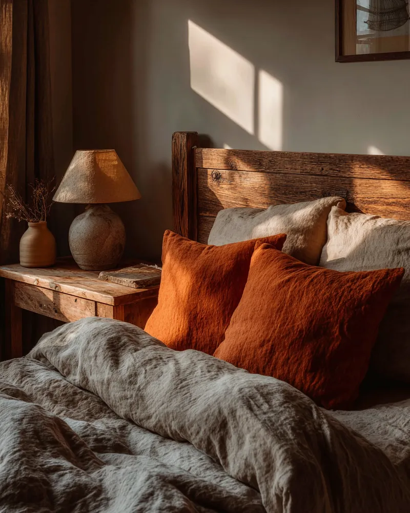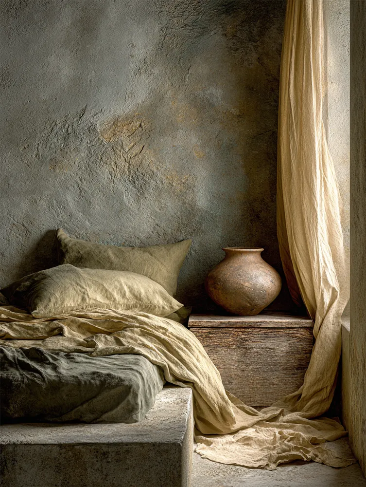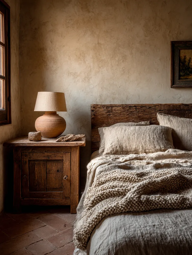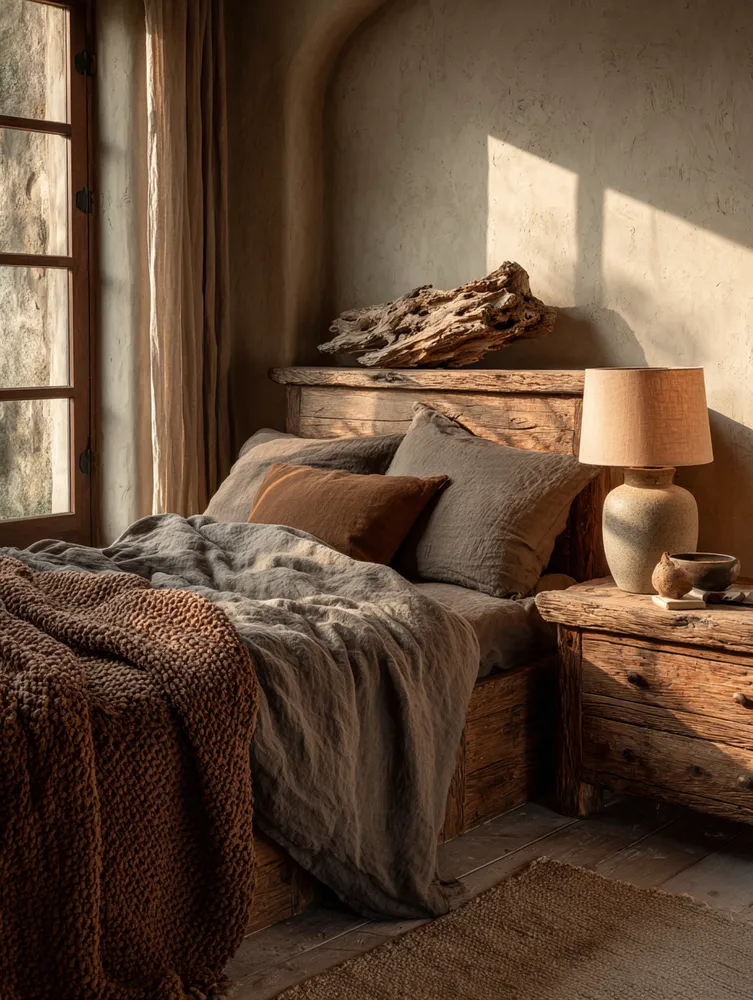 Create a bedroom that whispers serenity and embraces the beauty of imperfection, à la Wabi-Sabi. This design philosophy is about finding peace in the simple, the natural, and the aged.