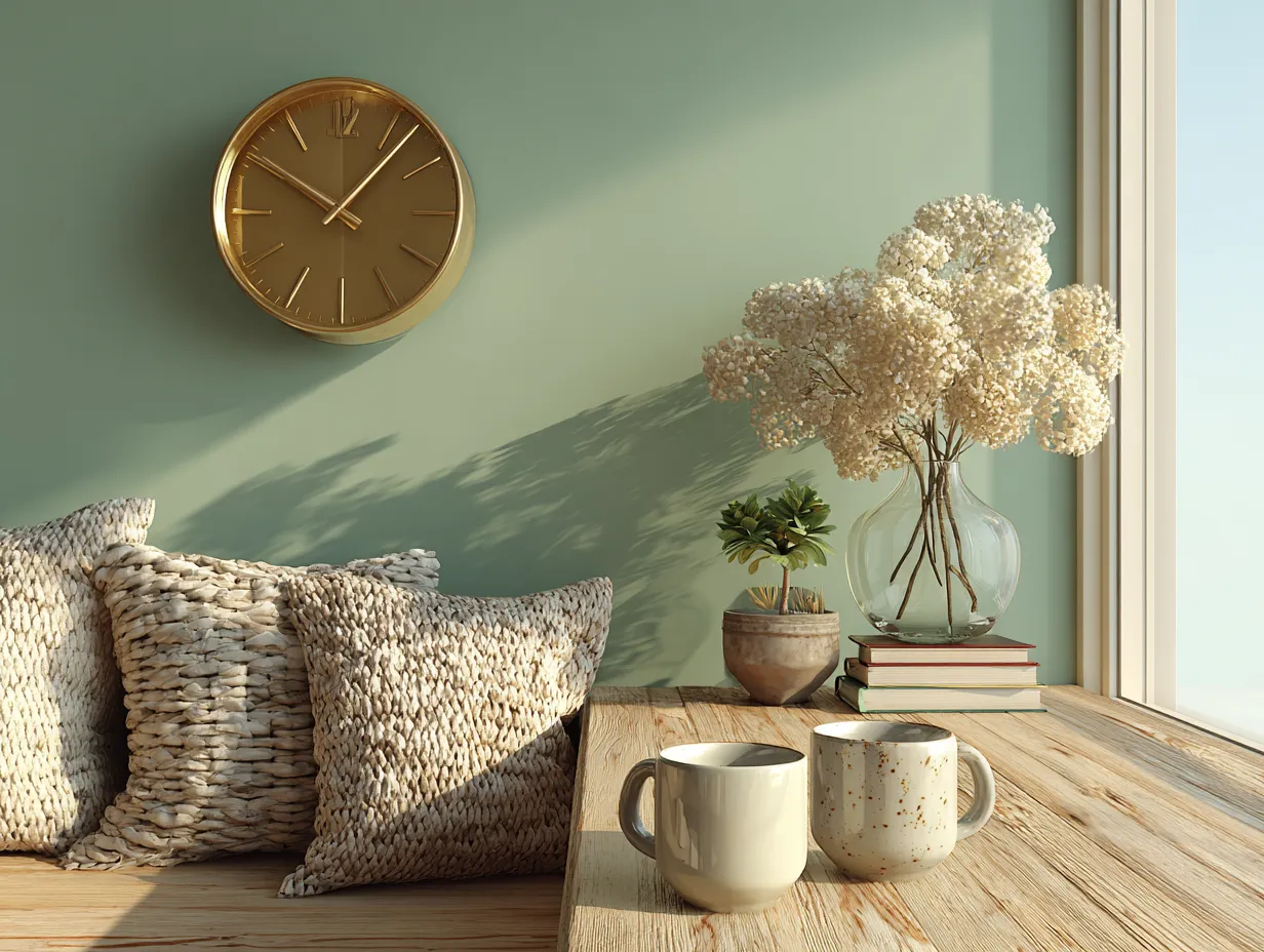 * **Natural Materials:** A light oak tabletop, paired with handmade ceramic mugs.
