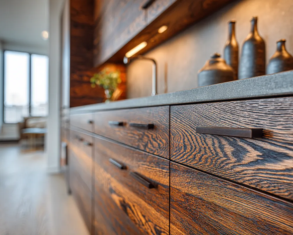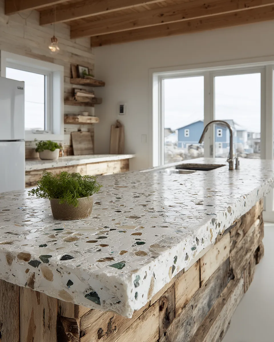 ♻️ **Recycled Materials**: Countertops made from recycled glass or paper, reclaimed wood cabinets.