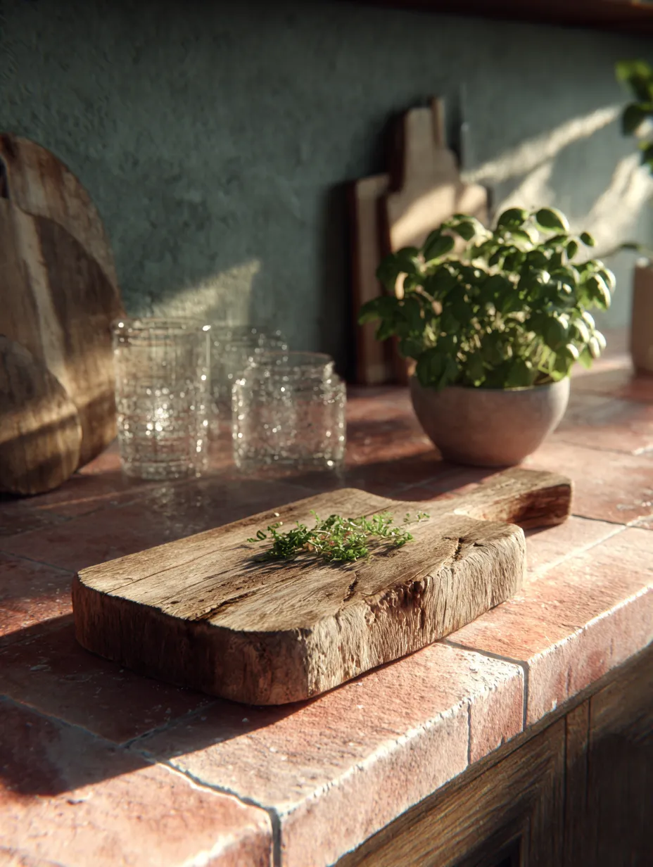 Focus on natural, tactile materials: unglazed ceramic tiles, rough-hewn wood cutting boards, and artisanal glassware that shows subtle variations.