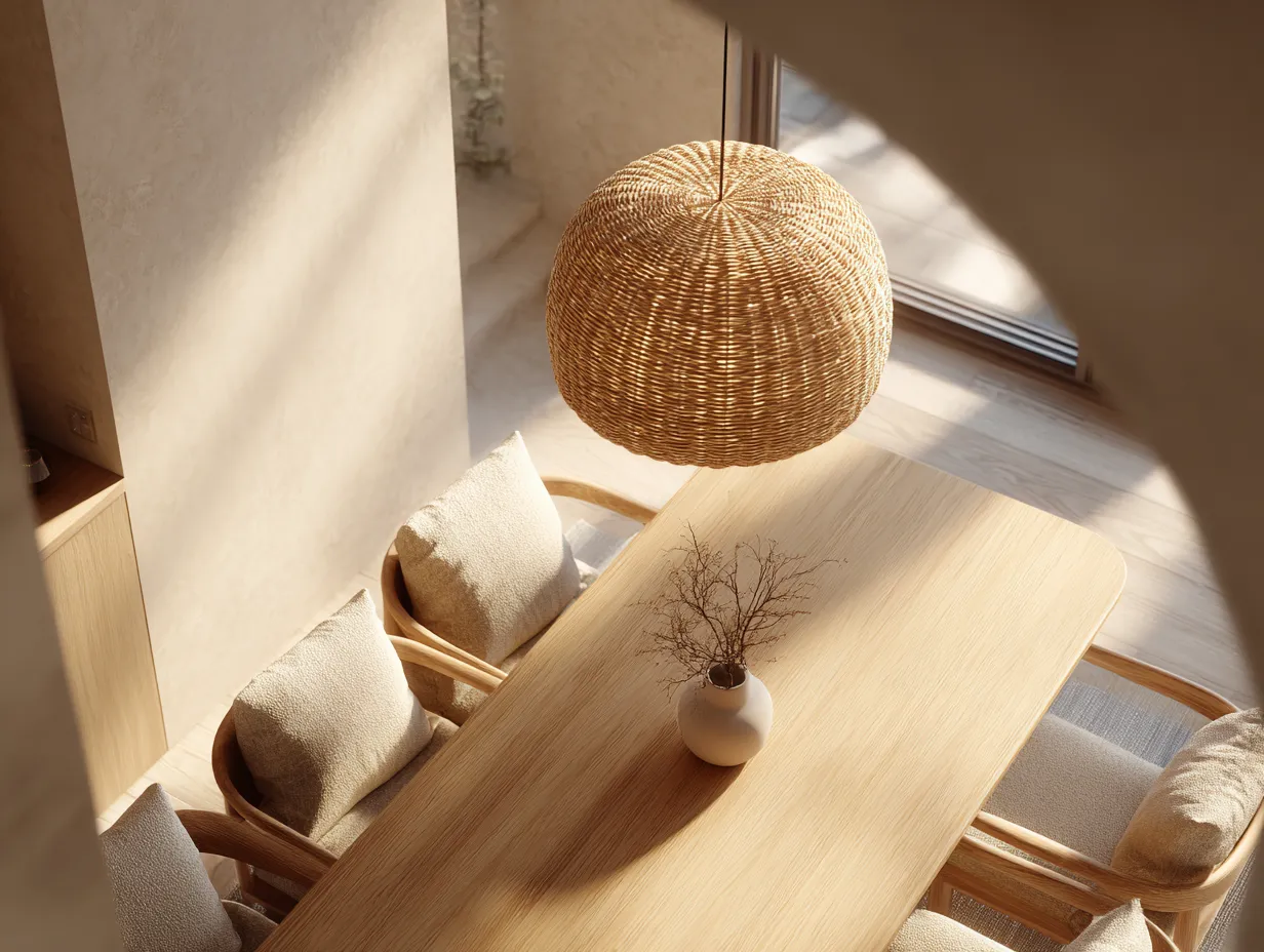 - **Strategic lighting:** A pendant light with a natural material shade (rattan, ceramic).