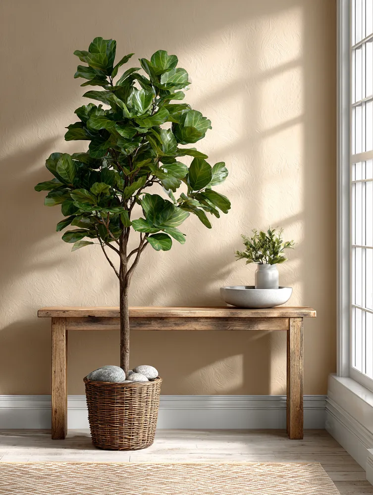 - **Wood Tones:** A simple wooden console table or bench in a light, natural wood (oak, bamboo).
