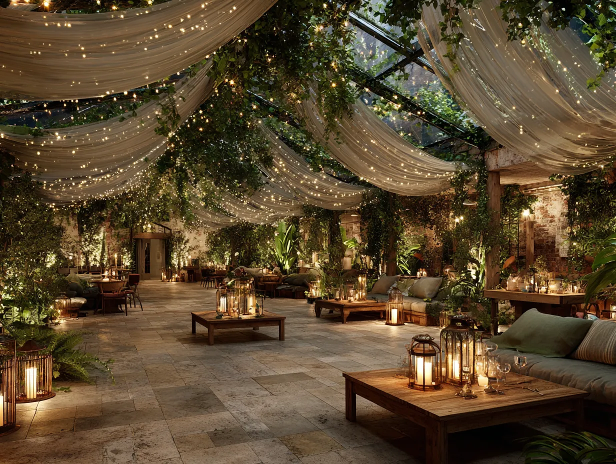 * **Lanterns:** Place decorative lanterns (solar-powered or LED) on tables or hanging from beams.