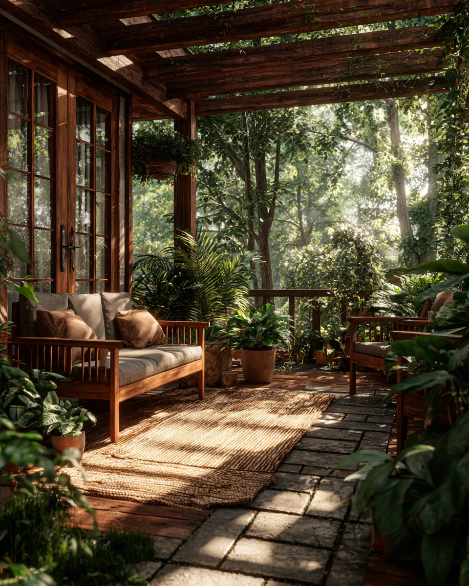 * **Natural Materials:** Wood, stone, and plant life integrate the space with its surroundings.