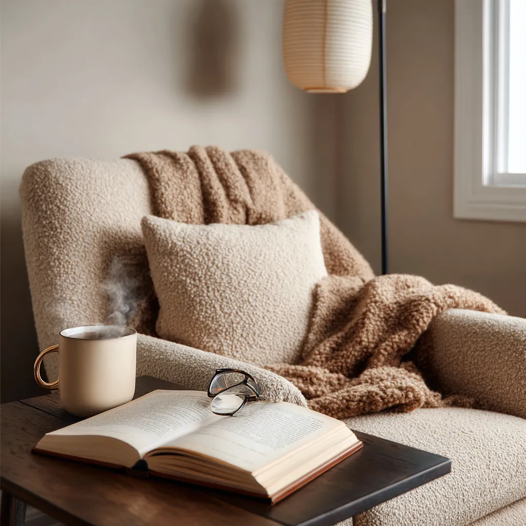 Start with a comfortable, low-profile armchair in a neutral linen or soft boucle. Pair it with a small, dark wood side table – just enough for a cup of tea and your current read.