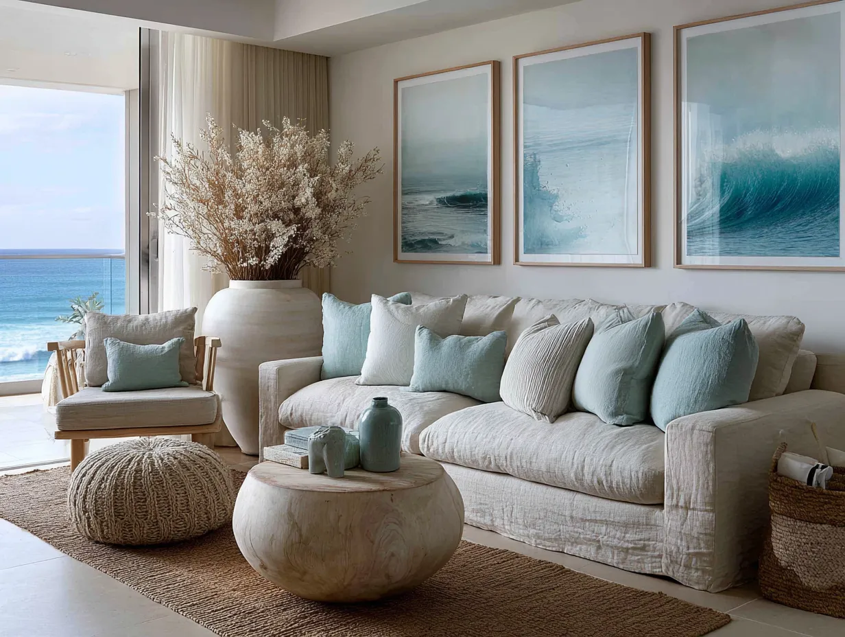Creating a living room that feels like a breath of fresh sea air is all about the right color combinations and textures. I love to blend neutrals with touches of ocean-inspired blues and greens for that perfect breezy vibe.