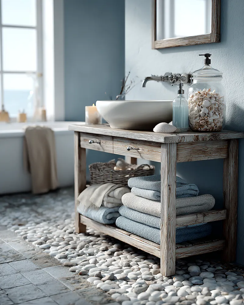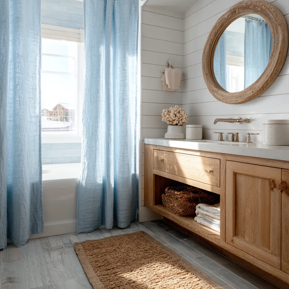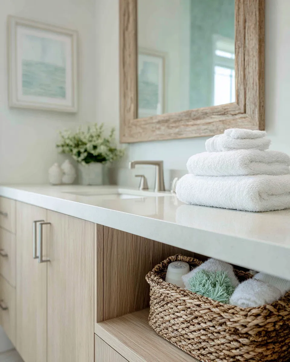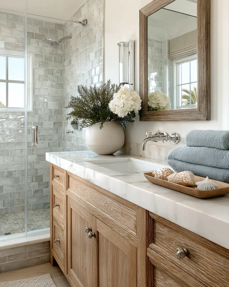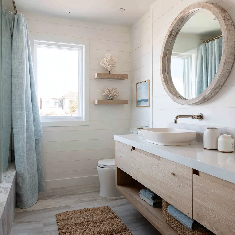Transform your bathroom into a personal spa retreat with simple coastal touches. Think light, airy, and calming for a truly relaxing experience.