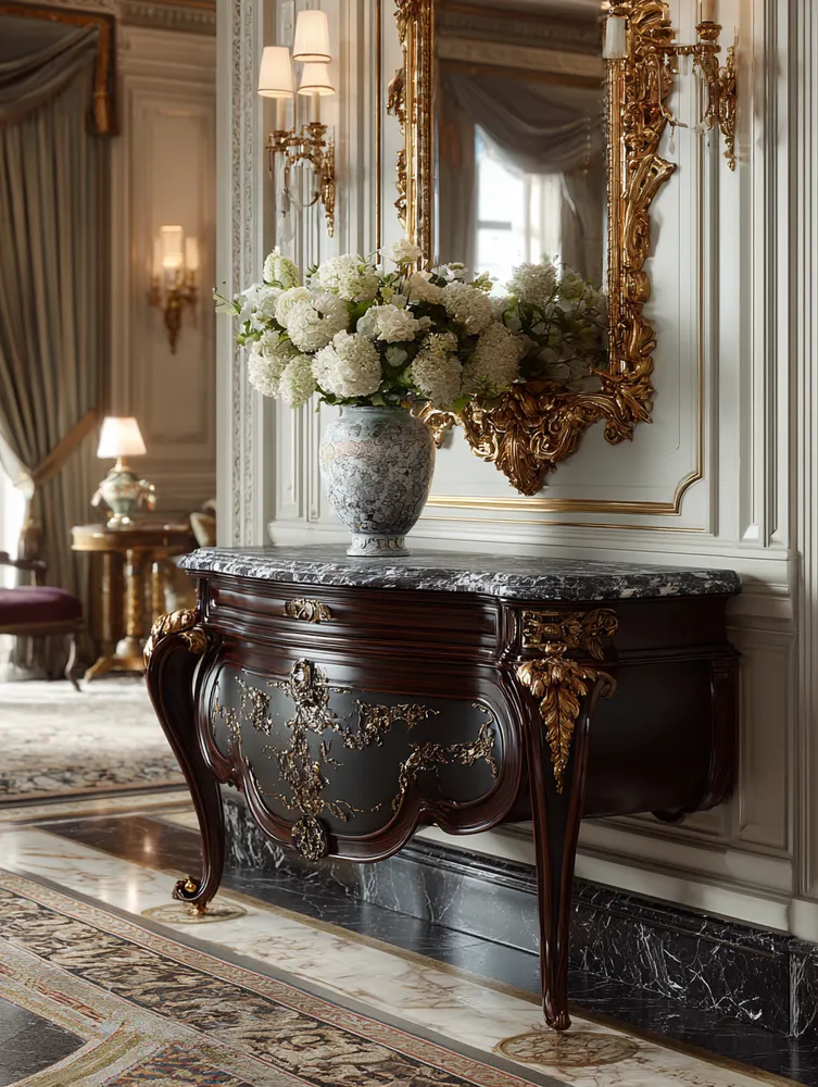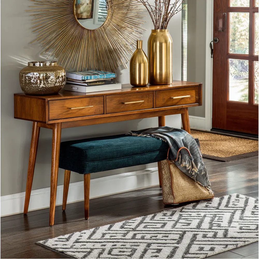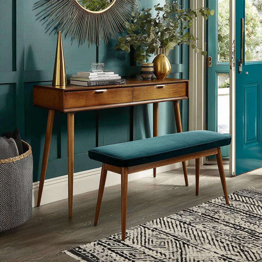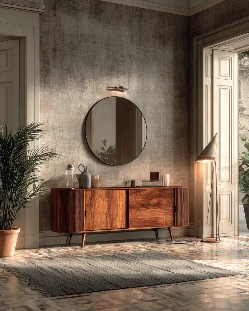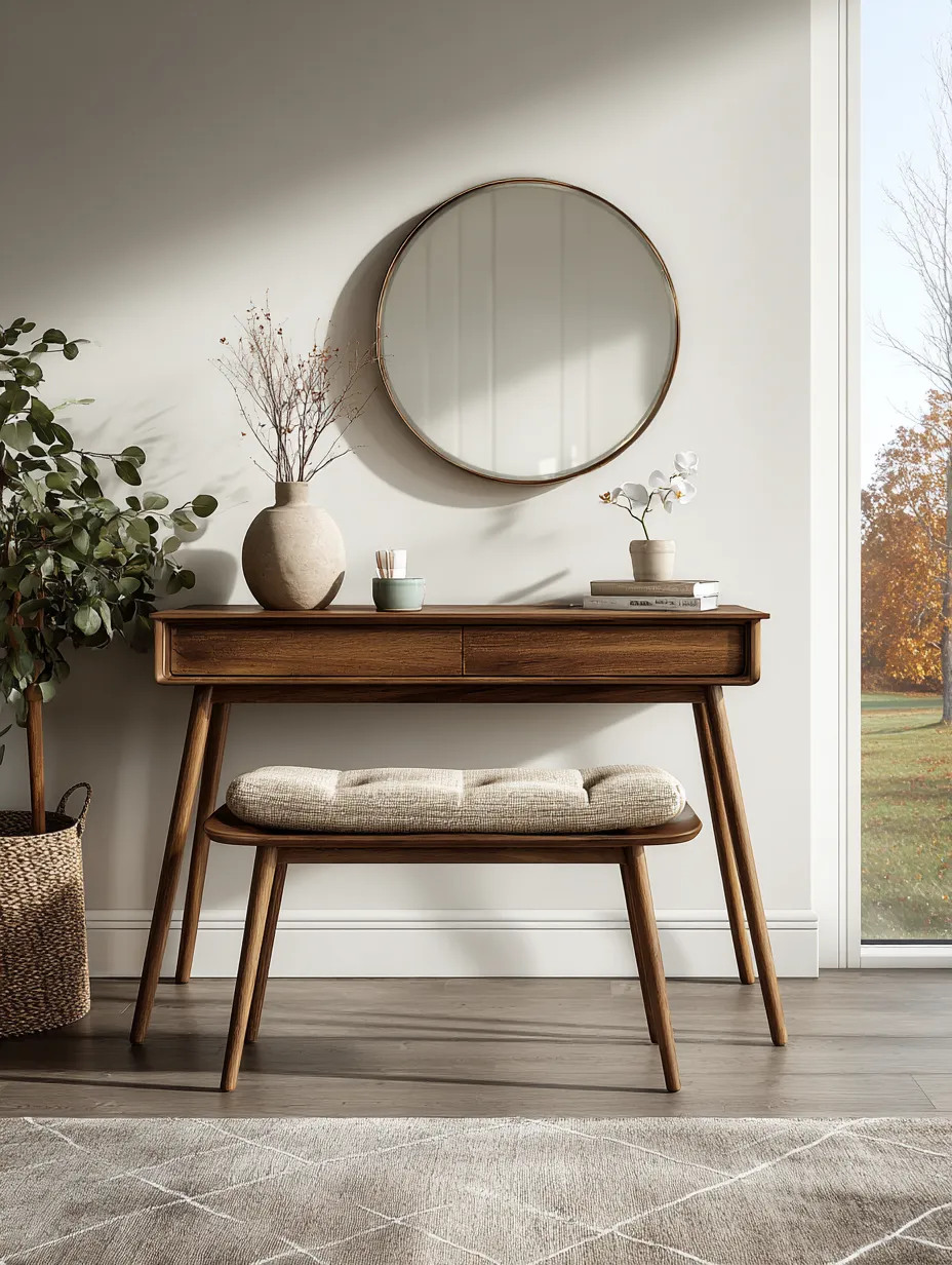Think a sleek console table, perhaps in walnut or teak, topped with a statement mirror or a piece of abstract art. Add a simple Scandinavian-inspired bench and some potted greenery.