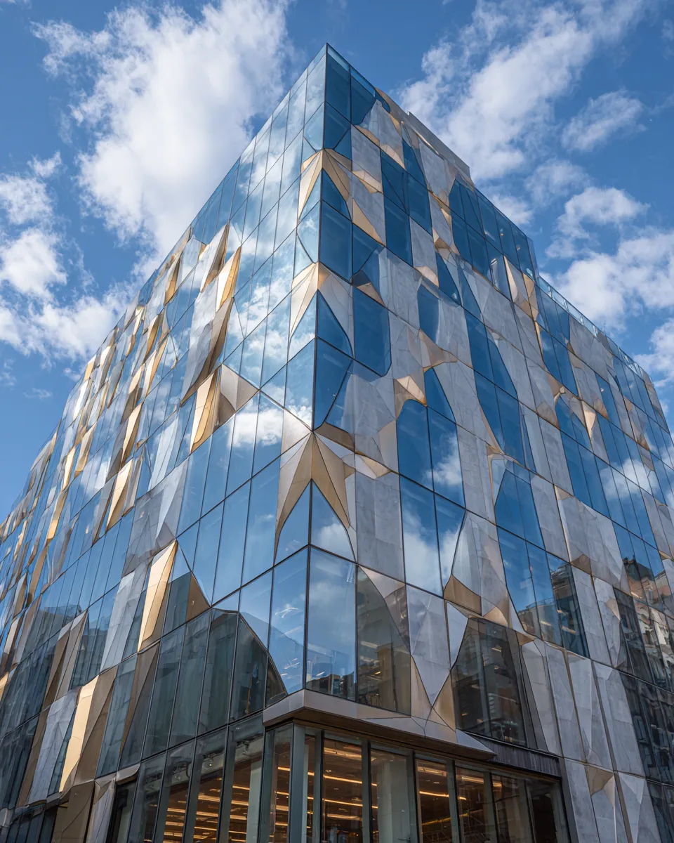 These abstract designs catch and reflect light in fascinating ways, offering a sense of movement and depth. Each facet becomes a canvas for the sky and its surroundings, creating a constantly changing architectural spectacle.